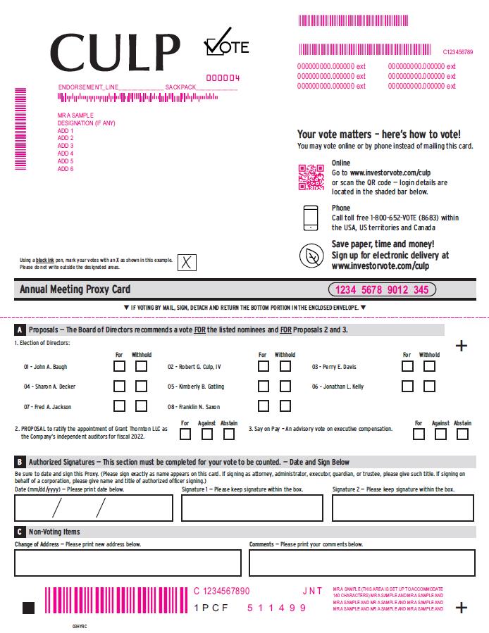 CULP VOTE 000004 C123456789 000000000.000000 ext 000000000.000000 ext 000000000.000000 ext 000000000.000000 ext 000000000.000000 ext 000000000.000000 ext ENDORSEMENT_LINE______________ SACKPACK_____________ MR A SAMPLE DESIGNATION (IF ANY) ADD 1 ADD 2 ADD 3 ADD 4 ADD 5 ADD 6 Your vote matters – here’s how to vote! You may vote online or by phone instead of mailing this card. Online Go to www.investorvote.com/culp or scan the QR code — login details are located in the shaded bar below. Save paper, time and money! Sign up for electronic delivery at www.investorvote.com/culp Phone Call toll free 1-800-652-VOTE (8683) within the USA, US territories and Canada Using a black ink pen, mark your votes with an X as shown in this example. Please do not write outside the designated areas. Annual Meeting Proxy Card 1234 5678 9012 345 IF VOTING BY MAIL, SIGN, DETACH AND RETURN THE BOTTOM PORTION IN THE ENCLOSED ENVELOPE. A Proposals — The Board of Directors recommends a vote FOR the listed nominees and FOR A Proposals 2 and 3. 1. Election of Directors: For Withhold For Withhold For Withhold 01 - John A. Baugh 04 - Sharon A. Decker 07 - Fred A. Jackson 02 - Robert G. Culp, IV 05 - Kimberly B. Gatling 08 - Franklin N. Saxon 03 - Perry E. Davis 06 - Jonathan L. Kelly 2. PROPOSAL to ratify the appointment of Grant Thornton LLC as the Company’s independent auditors for fiscal 2022. For Against Abstain 3. Say on Pay – An advisory vote on executive compensation. For Against Abstain B Authorized Signatures — This section must be completed for your vote to be counted. — Date and Sign Below Be sure to date and sign this Proxy. (Please sign exactly as name appears on this card. If signing as attorney, administrator, executor, guardian, or trustee, please give such title. If signing on behalf of a corporation, please give name and title of authorized officer signing.) Date (mm/dd/yyyy) — Please print date below. Signature 1 — Please keep signature within the box. Signature 2 — Please keep signature within the box. C Non-Voting Items Change of Address — Please print new address below. Comments — Please print your comments below. C 1234567890 J N T 1 P C F 5 1 1 4 9 9 MR A SAMPLE (THIS AREA IS SET UP TO ACCOMMODATE 140 CHARACTERS) MR A SAMPLE AND MR A SAMPLE AND MR A SAMPLE AND MR A SAMPLE AND MR A SAMPLE AND MR A SAMPLE AND MR A SAMPLE AND MR A SAMPLE AND 03HYRC