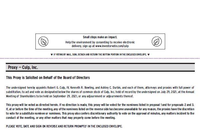 Small steps make an impact. Help the environment by consenting to receive electronic delivery, sign up at www.investorvote.com/culp IF VOTING BY MAIL, SIGN, DETACH AND RETURN THE BOTTOM PORTION IN THE ENCLOSED ENVELOPE. Proxy — Culp, Inc. This Proxy is Solicited on Behalf of the Board of Directors The undersigned hereby appoints Robert G. Culp, IV, Kenneth R. Bowling, and Ashley C. Durbin, and each of them, attorneys and proxies with full power of substitution, to act and vote as designated below the shares of common stock of Culp, Inc. held of record by the undersigned on July 29, 2021, at the Annual Meeting of Shareholders to be held on September 29, 2021, or any adjournment or adjournments thereof. This proxy will be voted as directed herein. If no direction is made, this proxy will be voted for the nominees listed in proposal 1 and for proposals 2 and 3. If, at or before the time of the meeting, any of the nominees listed on the reverse side has become unavailable for any reason, the proxies have the discretion to vote for a substitute nominee or nominees. This proxy also confers discretionary authority to vote on the approval of minutes, any matters incident to the conduct of the meeting, or any other matters that may properly come before the meeting. PLEASE VOTE, DATE AND SIGN ON REVERSE AND RETURN PROMPTLY IN THE ENCLOSED ENVELOPE.