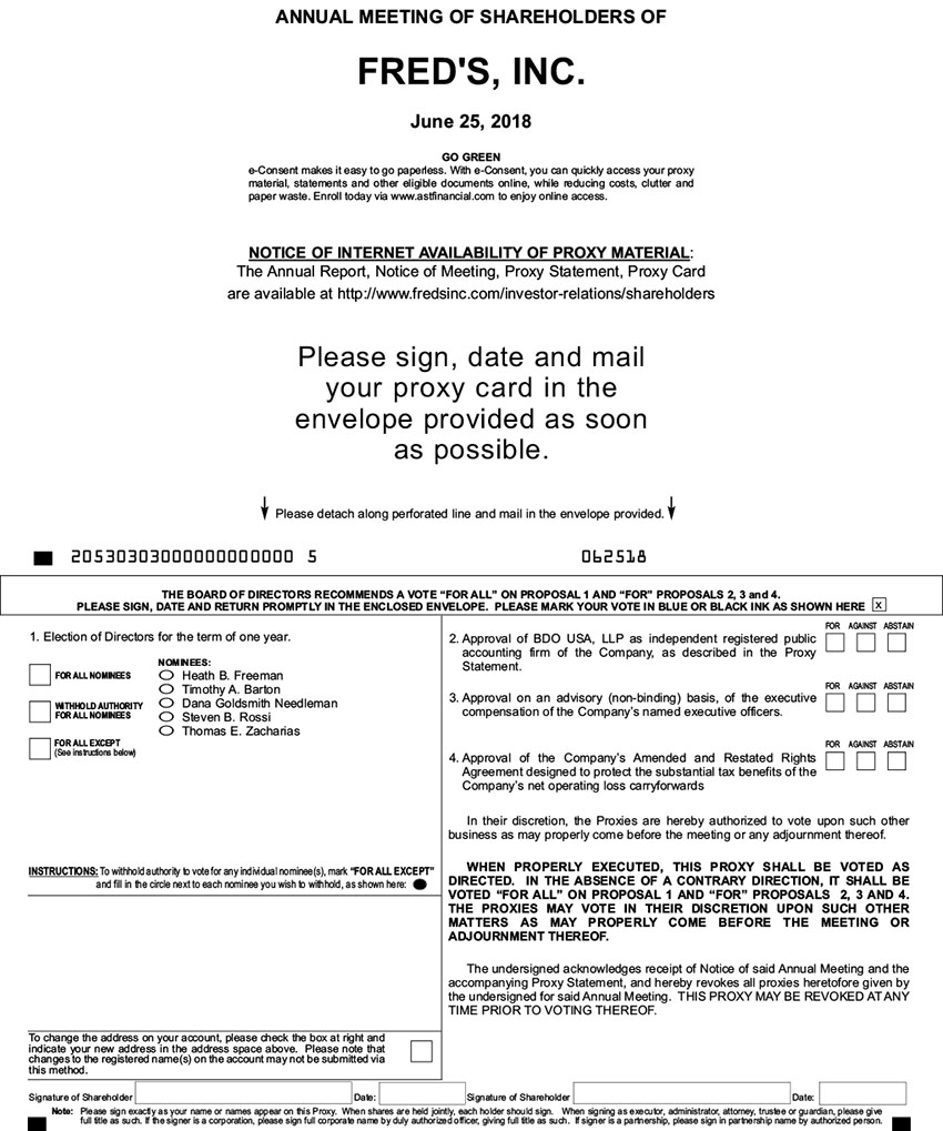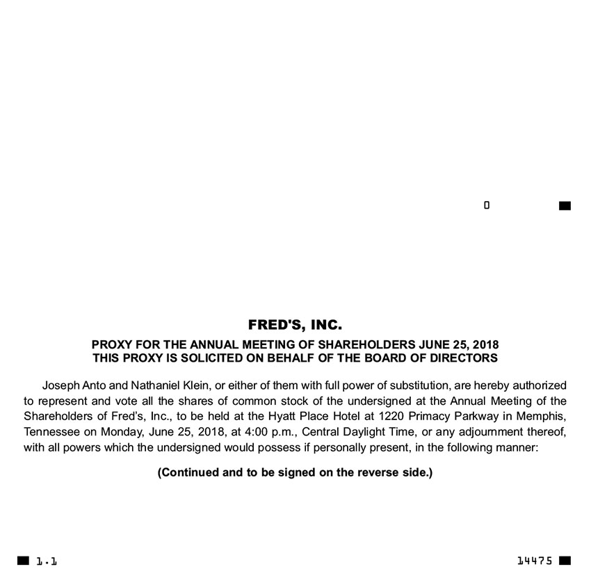 Joseph Anto and Nathaniel Klein, or either of them with full power of substitution, are hereby authorized to represent and vote all the shares of common stock of the undersigned at the Annual Meeting of the Shareholders of Fred’s, Inc., to be held at the Hyatt Place Hotel at 1220 Primacy Parkway in Memphis, Tennessee on Monday, June 25, 2018, at 4:00 p.m., Central Daylight Time, or any adjournment thereof, with all powers which the undersigned would possess if personally present, in the following manner: