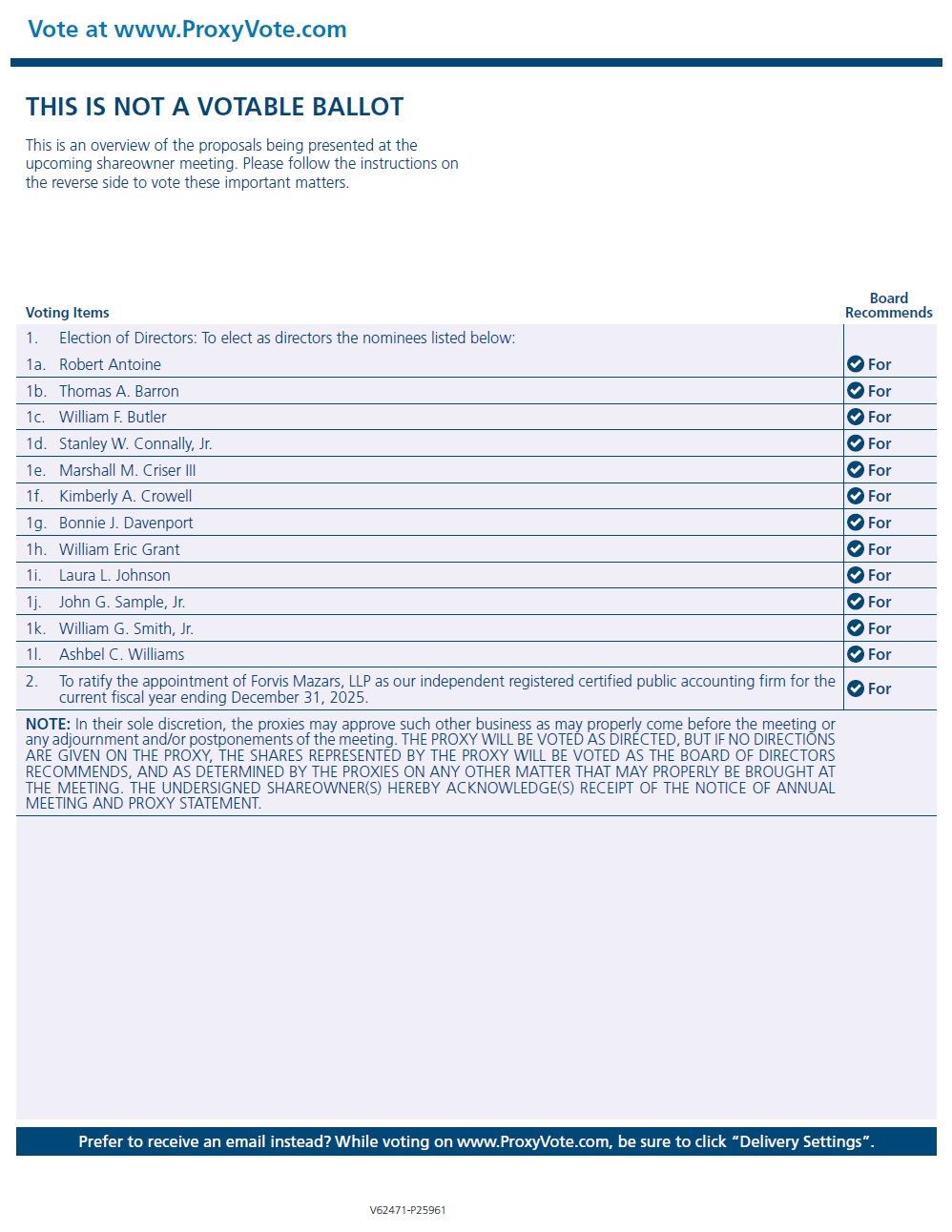 THIS IS NOT A VOTABLE BALLOT This is an overview of the proposals being presented at the upcoming shareowner meeting. Please follow the instructions on the reverse side to vote these important matters. Vote at www.ProxyVote.com Prefer to receive an email instead? While voting on www.ProxyVote.com, be sure to click “Delivery Settings”. V62471-P25961 Voting Items Board Recommends 1. Election of Directors: To elect as directors the nominees listed below: 1a. Robert Antoine For 1b. Thomas A. Barron For 1c. William F. Butler For 1d. Stanley W. Connally, Jr. For 1e. Marshall M. Criser III For 1f. Kimberly A. Crowell For 1g. Bonnie J. Davenport For 1h. William Eric Grant For 1i. Laura L. Johnson For 1j. John G. Sample, Jr. For 1k. William G. Smith, Jr. For 1l. Ashbel C. Williams For 2. To ratify the appointment of Forvis Mazars, LLP as our independent registered certified public accounting firm for the current fiscal year ending December 31, 2025. For NOTE: In their sole discretion, the proxies may approve such other business as may properly come before the meeting or any adjournment and/or postponements of the meeting. THE PROXY WILL BE VOTED AS DIRECTED, BUT IF NO DIRECTIONS ARE GIVEN ON THE PROXY, THE SHARES REPRESENTED BY THE PROXY WILL BE VOTED AS THE BOARD OF DIRECTORS RECOMMENDS, AND AS DETERMINED BY THE PROXIES ON ANY OTHER MATTER THAT MAY PROPERLY BE BROUGHT AT THE MEETING. THE UNDERSIGNED SHAREOWNER(S) HEREBY ACKNOWLEDGE(S) RECEIPT OF THE NOTICE OF ANNUAL MEETING AND PROXY STATEMENT.