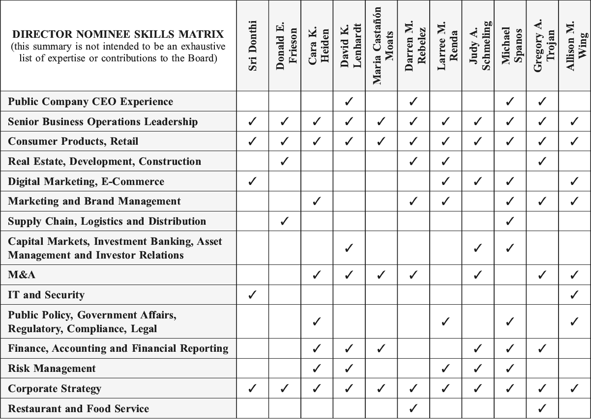 ![]() | Darren M. Rebelez Board Chair President and CEO, Casey’s General Stores, Inc. | | | ✔ | | | 58 | | | 2019 | | | | | | | | | | | Gender Diversity = 5 of 11 female (45%) Racial/Ethnic Diversity = 4 of 11 diverse (36%) Average Age = 61 years Average Tenure = 5 years | | | | |||||