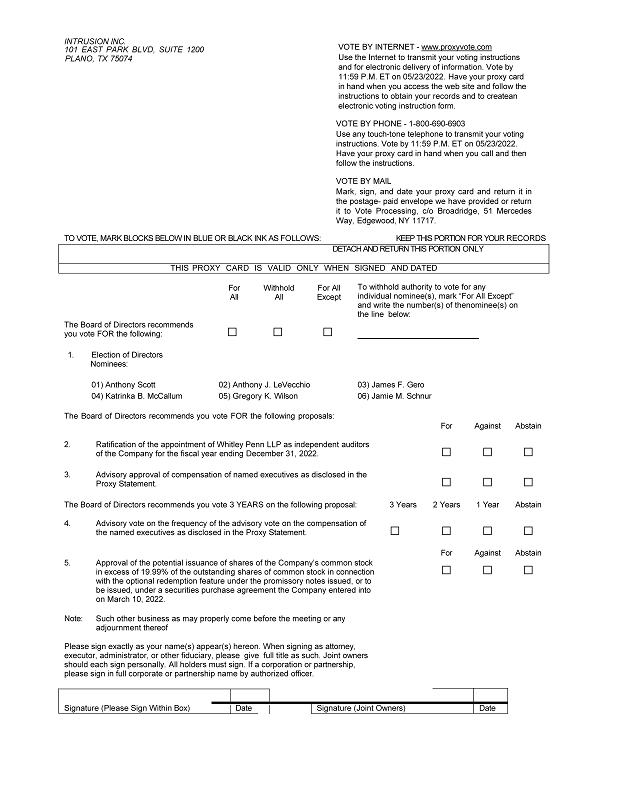 INTRUSION INC. 101 EAST PARK BLVD, SUITE 1200 PLANO, TX 75074 VOTE BY INTERNET - www.proxyvote.com Use the Internet to transmit your voting instructions and for electronic delivery of information. Vote by 11:59 P.M. ET on 05/23/2022. Have your proxy card in hand when you access the web site and follow the instructions to obtain your records and to createan electronic voting instruction form. VOTE BY PHONE - 1 - 800 - 690 - 6903 Use any touch - tone telephone to transmit your voting instructions. Vote by 11:59 P.M. ET on 05/23/2022. Have your proxy card in hand when you call and then follow the instructions. VOTE BY MAIL Mark, sign, and date your proxy card and return it in the postage - paid envelope we have provided or return it to Vote Processing, c/o Broadridge, 51 Mercedes Way, Edgewood, NY 11717 . TO VOTE, MARK BLOCKS BELOW IN BLUE OR BLACK INK AS FOLLOWS: KEEP THIS PORTION FOR YOUR RECORDS DETACH AND RETURN THIS PORTION ONLY THIS PROXY CARD IS VALID ONLY WHEN SIGNED AND DATED For All Withhold All For All Except To withhold authority to vote for any individual nominee(s), mark “For All Except” and write the number(s) of thenominee(s) on the line below: The Board of Directors recommends you vote FOR the following: Ƒ Ƒ Ƒ 1. Election of Directors Nominees: 01) Anthony Scott 02) Anthony J. LeVecchio 03) James F. Gero 04) Katrinka B. McCallum 05) Gregory K. Wilson 06) Jamie M. Schnur The Board of Directors recommends you vote FOR the following proposals: For Against Abstain 2. Ratification of the appointment of Whitley Penn LLP as independent auditors of the Company for the fiscal year ending December 31, 2022. Ƒ Ƒ Ƒ 3. Advisory approval of compensation of named executives as disclosed in the Proxy Statement. Ƒ Ƒ Ƒ The Board of Directors recommends you vote 3 YEARS on the following proposal: 3 Years 2 Years 1 Year Abstain 4. Advisory vote on the frequency of the advisory vote on the compensation of the named executives as disclosed in the Proxy Statement. Ƒ Ƒ Ƒ Ƒ For Against Abstain 5. Approval of the potential issuance of shares of the Company’s common stock in excess of 19.99% of the outstanding shares of common stock in connection with the optional redemption feature under the promissory notes issued, or to be issued, under a securities purchase agreement the Company entered into on March 10, 2022. Ƒ Ƒ Ƒ Note: Such other business as may properly come before the meeting or any adjournment thereof Please sign exactly as your name(s) appear(s) hereon. When signing as attorney, executor, administrator, or other fiduciary, please give full title as such. Joint owners should each sign personally. All holders must sign. If a corporation or partnership, please sign in full corporate or partnership name by authorized officer. Signature (Please Sign Within Box) Date Signature (Joint Owners) Date