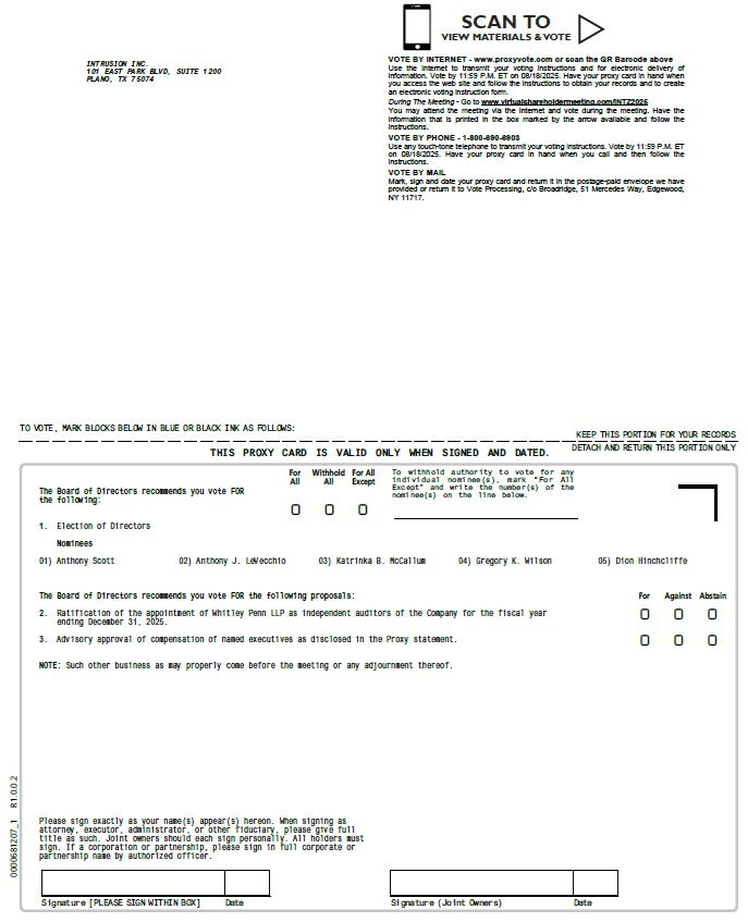 INTRUSION INC. 101 EAST PARK BLVD, SUITE 1200 PLANO, TX 75074 1 Line Address Investor 2 Line Address Investor 3 Line Address Investor 4 Line Address Investor Investor Address Line 5 John Sample 1234 ANYWHERE STREET ANY CITY, ON A1A 1A1 SCAN TO VIEW MATERIALS & VOTE VOTE BY INTERNET - www.proxyvote.com or scan the QR Barcode above Use the Internet to transmit your voting instructions and for electronic delivery of information. Vote by 11:59 P.M. ET on 08/17/2025. Have your proxy card in hand when you access the web site and follow the instructions to obtain your records and to create an electronic voting instruction form . During The Meeting - Go to www . virtualshareholdermeeting . com/INTZ 2025 You may attend the meeting via the Internet and vote during the meeting . Have the information that is printed in the box marked by the arrow available and follow the instructions . VOTE BY PHONE - 1 - 800 - 690 - 6903 Use any touch - tone telephone to transmit your voting instructions. Vote by 11:59 P.M. ET on 08/17/2025. Have your proxy card in hand when you call and then follow the instructions. VOT BY MAIL Mark, sign and date your proxy card and return it in the postage - paid envelope we have provided or return it to Vote Processing, c/o Broadridge, 51 Mercedes Way, Edgewood, NY 11717 . NAME THE COMPANY NAME INC. - COMMON THE COMPANY NAME INC. - CLASS A THE COMPANY NAME INC. - CLASS B THE COMPANY NAME INC. - CLASS C THE COMPANY NAME INC. - CLASS D THE COMPANY NAME INC. - CLASS E THE COMPANY NAME INC. - CLASS F THE COMPANY NAME INC. - 401 K CONTROL # → SHARES 123,456,789,012.12345 123,456,789,012.12345 123,456,789,012.12345 123,456,789,012.12345 123,456,789,012.12345 123,456,789,012.12345 123,456,789,012.12345 123,456,789,012.12345 1 OF 1 1 2