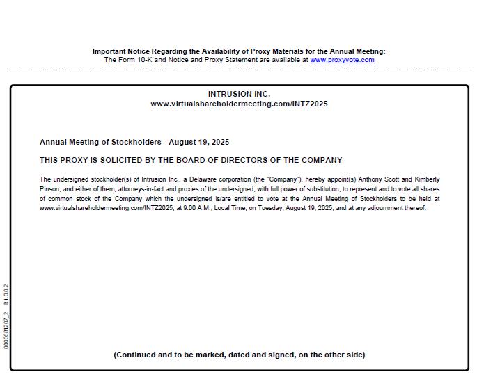 Important Notice Regarding the Availability of Proxy Materials for the Annual Meeting: The Form 10 - K and Notice and Proxy Statement are available at www.proxyvote.com INTRUSION INC. www.virtualshareholdermeeting.com/INTZ2025 Annual Meeting of Stockholders - August 18, 2025 THIS PROXY IS SOLICITED BY THE BOARD OF DIRECTORS OF THE COMPANY The undersigned stockholder(s) of Intrusion Inc . , a Delaware corporation (the "Company"), hereby appoint(s) Anthony Scott and Kimberly Pinson, and either of them, attorneys - in - fact and proxies of t h e undersigned, with full power of substitution, to represent and t o vote all shares of common stock of the Company which the undersigned is/are entitled to vote at the Annual Meeting of Stockholders to be held at www . virtualshareholdermeeting . com/INTZ 2025 , at 9 : 00 A . M . , Local Time, on Monday, A u g us t 18 , 2025 , and at any adjournment thereof . (Continued and to be marked, dated and signed, on the other side) 0000680776_2 R1.0.0.2