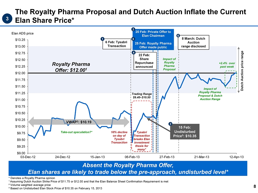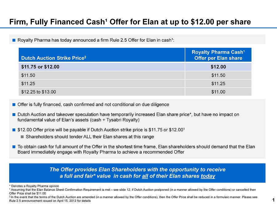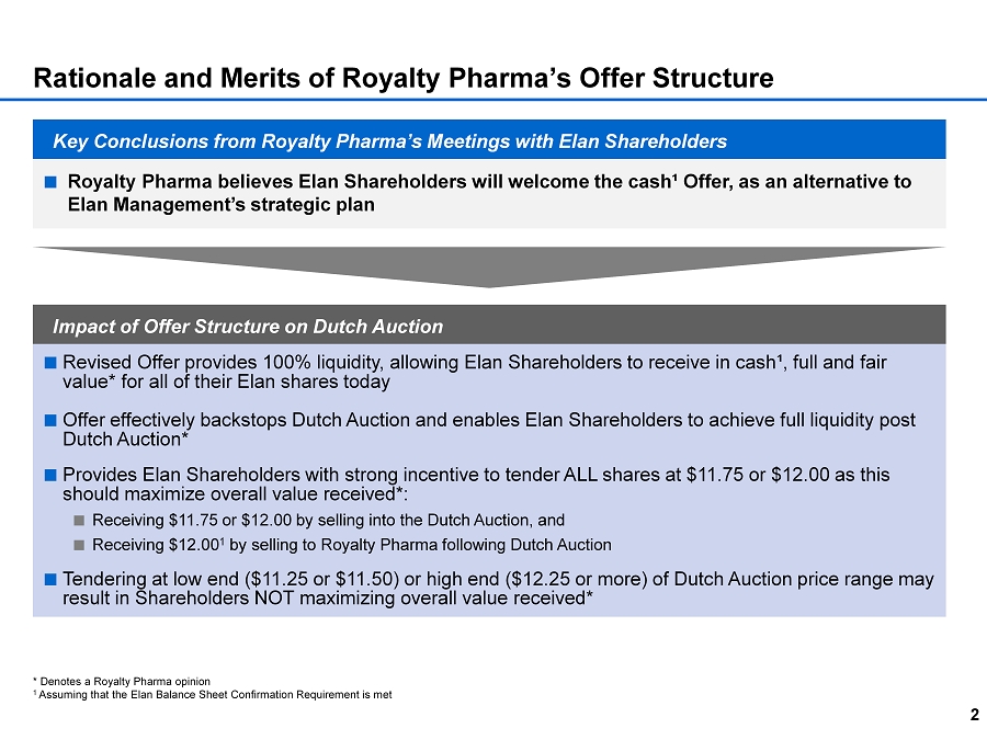 1 * Denotes a Royalty Pharma opinion ¹ Assuming that the Elan Balance Sheet Confirmation Requirement is met – see slide 12; if Dutch Auction postponed (in a manner allowed by the Offer conditions) or cancelled then Offer Price shall be $11.00 2 In the event that the terms of the Dutch Auction are amended (in a manner allowed by the Offer conditions), then the Offer Pr ice shall be reduced in a formulaic manner. Please see Rule 2.5 announcement issued on April 15, 2013 for details ■ Offer is fully financed, cash confirmed and not conditional on due diligence ■ Dutch Auction and takeover speculation have temporarily increased Elan share price*, but have no impact on fundamental value of Elan’s assets (cash + Tysabri Royalty ) ■ $12.00 Offer price will be payable if Dutch Auction strike price is $11.75 or $12.00 1 ■ Shareholders should tender ALL their Elan shares at this range ■ To obtain cash for full amount of the Offer in the shortest time frame, Elan shareholders should demand that the Elan Board immediately engage with Royalty Pharma to achieve a recommended Offer Firm, Fully Financed Cash¹ Offer for Elan at up to $12.00 per share The Offer provides Elan Shareholders with the opportunity to receive a full and fair* value in cash for all of their Elan shares today Dutch Auction Strike Price 2 Royalty Pharma Cash¹ Offer per Elan share $11.75 or $12.00 $12.00 $11.50 $11.50 $11.25 $11.25 $12.25 to $13.00 $11.00 ■ Royalty Pharma has today announced a firm Rule 2.5 Offer for Elan in cash¹: