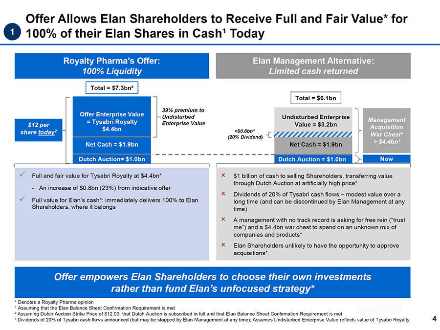 Key Considerations for Elan Shareholders 3 ■ Fully financed, cash confirmed and not conditional on due diligence ■ Provides 100% liquidity, allowing Elan Shareholders to receive full and fair value* for all of their Elan shares in cash² today ■ Puts $4.4bn 3 value on Tysabri Royalty* – a $0.8bn or 23% increase from our earlier Proposal ■ Premium of 39% 3 to Undisturbed Enterprise Value and 35% to Biogen Benchmark 3,4 * ■ High P/E (2015E: 31x) and EV/EBITDA (2015E: 16x) multiples 3 * At what price would Elan shares trade absent the Royalty Pharma Offer? * Denotes a Royalty Pharma opinion 1 Assuming Dutch Auction Strike Price of $11.75 or $12.00 and that the Elan Balance Sheet Confirmation Requirement is met 2 Assuming that the Elan Balance Sheet Confirmation Requirement is met 3 Assuming Dutch Auction Strike Price of $12.00, that Dutch Auction is subscribed in full and that the Elan Balance Sheet Confirmation Requirement is met 4 Assuming Biogen acquired approximately 50% of Elan’s prior economics in Tysabri and Elan retained approximately the remaining 50% of the economics in Tysabri * and received a $3.25bn cash payment 5 $1bn divided by 599m Elan shares outstanding; based on pro rata return Royalty Pharma $12.00 Offer ¹ is Compelling Elan’s High Risk Strategy* ■ Shareholders potentially receive less than $1.70 5 in cash through Dutch Auction and retain substantial risk* ■ Elan’s senior management lacks successful acquisition / in - licensing track record at Elan ■ Elan has no operating assets to drive acquisition synergies ■ Very difficult to acquire companies / products at values that support Elan share price* ■ Post 6 February Tysabri Transaction, Elan has little or no strategic value* ■ Artificially high price range transfers value away from remaining Shareholders absent Royalty Pharma Offer* ■ A Strike Price of $11.75 or $12.00 achieves best price from Royalty Pharma* Perspectives on the Dutch Auction 1 2 3