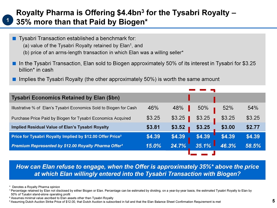 4 Offer Allows Elan Shareholders to Receive Full and Fair Value* for 100% of their Elan Shares in Cash¹ Today Royalty Pharma’s Offer: 100% Liquidity ü Full and fair value for Tysabri Royalty at $4.4bn* - An increase of $0.8bn (23%) from indicative offer ü Full value for Elan’s cash*: immediately delivers 100% to Elan Shareholders, where it belongs Offer empowers Elan Shareholders to choose their own investments rather than fund Elan’s unfocused strategy* û $1 billion of cash to selling Shareholders, transferring value through Dutch Auction at artificially high price* û Dividends of 20% of Tysabri cash flows – modest value over a long time (and can be discontinued by Elan Management at any time) û A management with no track record is asking for free rein (“trust me”) and a $4.4bn war chest to spend on an unknown mix of companies and products* û Elan Shareholders unlikely to have the opportunity to approve acquisitions* Total = $7.3bn² Total = $6.1bn Dutch Auction = $1.0bn Undisturbed Enterprise Value = $3.2bn Net Cash = $1.9bn Offer Enterprise Value = Tysabri Royalty $4.4bn Dutch Auction= $1.0bn $12 per share today 2 * Denotes a Royalty Pharma opinion 1 Assuming that the Elan Balance Sheet Confirmation Requirement is met ² Assuming Dutch Auction Strike Price of $12.00, that Dutch Auction is subscribed in full and that Elan Balance Sheet Confirmation Requirement is met ³ Dividends of 20% of Tysabri cash flows announced (but may be stopped by Elan Management at any time); Assumes Undisturbed Enterprise Value reflects value of Tysabri Royalty 1 Net Cash = $1.9bn 39% premium to Undisturbed Enterprise Value Now Management Acquisition War Chest* > $4.4bn³ ≈$0.6bn³ (20% Dividend ) Elan Management Alternative: Limited cash returned