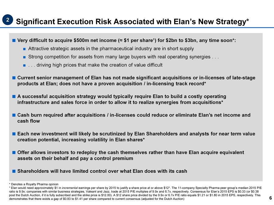 Tysabri Economics Retained by Elan ($bn) Illustrative % of Elan’s Tysabri Economics Sold to Biogen for Cash 46% 48% 50% 52% 54% Purchase Price Paid by Biogen for Tysabri Economics Acquired $3.25 $3.25 $3.25 $3.25 $3.25 Implied Residual Value of Elan’s Tysabri Royalty $3.81 $3.52 $3.25 $3.00 $2.77 Price for Tysabri Royalty Implied by $12.00 Offer Price² $4.39 $4.39 $4.39 $4.39 $4.39 Premium Represented by $12.00 Royalty Pharma Offer³ 15.0% 24.7% 35.1% 46.3% 58.5% ■ Tysabri Transaction established a benchmark for: (a) value of the Tysabri Royalty retained by Elan 1, and (b) price of an arms - length transaction in which Elan was a willing seller* ■ In the Tysabri Transaction, Elan sold to Biogen approximately 50% of its interest in Tysabri for $3.25 billion* in cash ■ Implies the Tysabri Royalty (the other approximately 50%) is worth the same amount Royalty Pharma is Offering $4.4bn 3 for the Tysabri Royalty – 35% more than that Paid by Biogen* 5 How can Elan refuse to engage, when the Offer is approximately 35%* above the price at which Elan willingly entered into the Tysabri Transaction with Biogen ? 1 * Denotes a Royalty Pharma opinion 1 Percentage retained by Elan not disclosed by either Biogen or Elan. Percentage can be estimated by dividing, on a year - by - year basis, the estimated Tysabri Royalty to Elan by 50% of Tysabri stand - alone operating profit ² Assumes minimal value ascribed to Elan assets other than Tysabri Royalty 3 Assuming Dutch Auction Strike Price of $12.00, that Dutch Auction is subscribed in full and that the Elan Balance Sheet Confirmation Requirement is met