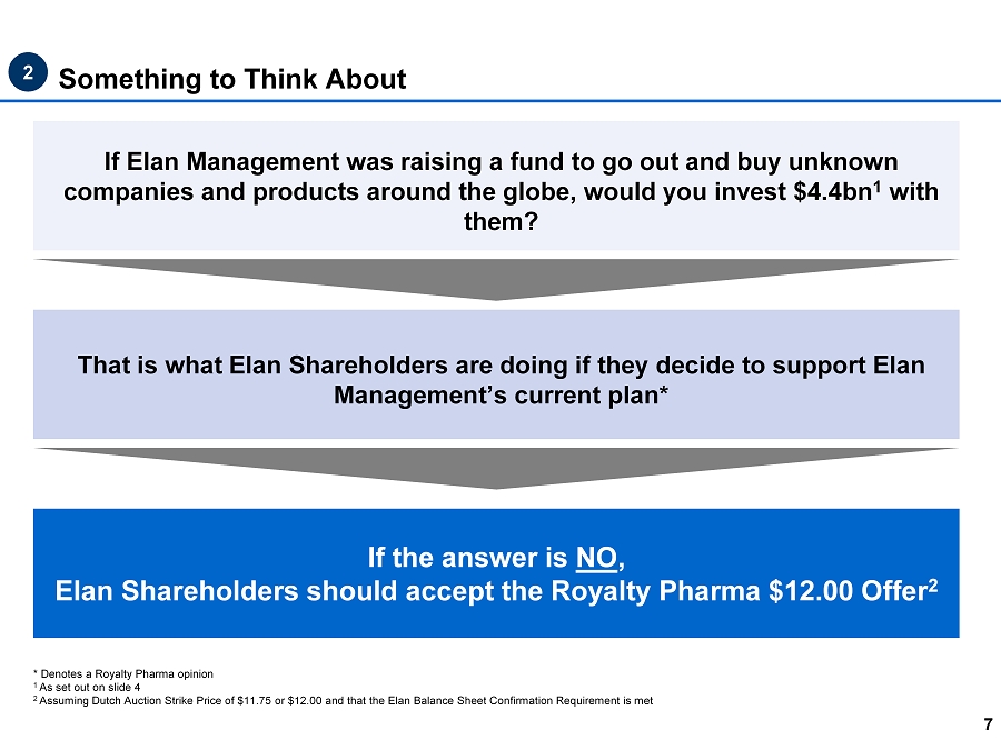 Significant Execution Risk Associated with Elan’s New Strategy* 6 ■ Very difficult to acquire $500m net income (≈ $1 per share¹) for $2bn to $3bn, any time soon*: ■ Attractive strategic assets in the pharmaceutical industry are in short supply ■ Strong competition for assets from many large buyers with real operating synergies . . . ■ . . . driving high prices that make the creation of value difficult ■ Current senior management of Elan has not made significant acquisitions or in - licenses of late - stage products at Elan; does not have a proven acquisition / in - licensing track record* ■ A successful acquisition strategy would typically require Elan to build a costly operating infrastructure and sales force in order to allow it to realize synergies from acquisitions* ■ Cash burn required after acquisitions / in - licenses could reduce or eliminate Elan’s net income and cash flow ■ Each new investment will likely be scrutinized by Elan Shareholders and analysts for near term value creation potential, increasing volatility in Elan shares* ■ Offer allows investors to redeploy the cash themselves rather than have Elan acquire equivalent assets on their behalf and pay a control premium ■ Shareholders will have limited control over what Elan does with its cash * Denotes a Royalty Pharma opinion ¹ Elan would need approximately $1 in incremental earnings per share by 2015 to justify a share price at or above $12*. The 11 - company Specialty Pharma peer group’s median 2015 P/E ratio is 9.9x; companies with similar business strategies, Valeant and Jazz, trade at 2015 P/E multiples of 9.9x and 6.7x, respectively. Consensus for Elan’s 2015 EPS is $0.33 (or $0.38 post the Dutch Auction, if it is fully subscribed and the strike price is $12.00). A $12 share price divided by the 9.9x or 6 .7x P/E ratio equals $1.21 or $1.80 in 2015 EPS, respectively. This demonstrates that there exists a gap of $0.83 to $1.41 per share compared to current consensus (adjusted for the Dutch Auction) 2