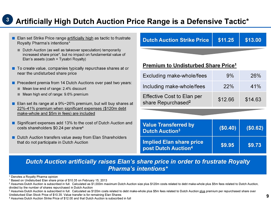The Royalty Pharma Proposal and Dutch Auction Inflate the Current Elan Share Price* 8 Absent the Royalty Pharma Offer, Elan shares are likely to trade below the pre - approach, undisturbed level* Dutch Auction price range Elan ADS price Trading Range $9.40 – $10.50 Impact of Royalty Pharma Proposal Impact of Royalty Pharma Proposal & Dutch Auction Range 3 6 Feb: Tysabri Transaction 20 Feb: Private Offer to Elan Chairman 25 Feb: Royalty Pharma Offer made public 22 Feb: Share Repurchase announced 4 3 1 5 * Denotes a Royalty Pharma opinion 1 Assuming Dutch Auction Strike Price of $11.75 or $12.00 and that the Elan Balance Sheet Confirmation Requirement is met ² Volume weighted average price ³ Based on Undisturbed Elan Stock Price of $10.35 on February 15, 2013 8 March: Dutch Auction range disclosed 6 $9.00 $9.25 $9.50 $9.75 $10.00 $10.25 $10.50 $10.75 $11.00 $11.25 $11.50 $11.75 $12.00 $12.25 $12.50 $12.75 $13.00 $13.25 03-Dec-12 24-Dec-12 15-Jan-13 06-Feb-13 27-Feb-13 21-Mar-13 12-Apr-13 VWAP 2 : $10.19 Take - out speculation?* 10% decline on day of Tysabri Transaction 15 Feb: Undisturbed Price 3 : $10.35 2 Tysabri Transaction breaks Elan investment thesis for many* +2.4% over past week Royalty Pharma Offer: $12.00 1