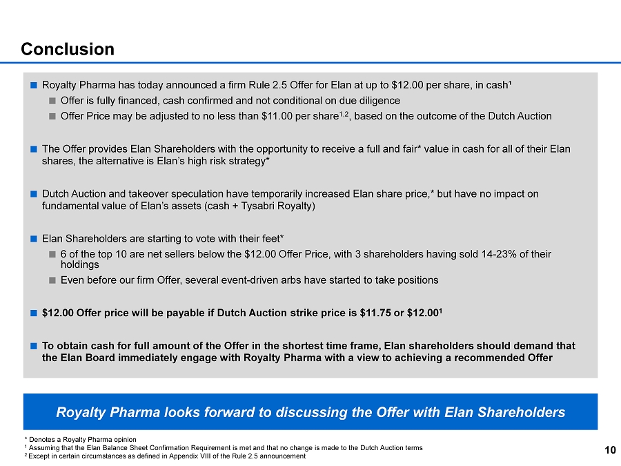 Dutch Auction Strike Price $11.25 $13.00 Premium to Undisturbed Share Price 1 Excluding make - whole/fees 9% 26% Including make - whole/fees 22% 41% Effective Cost to Elan per share Repurchased 2 $12.66 $14.63 Value Transferred by Dutch Auction 3 ($0.40) ($0.62) Implied Elan share price post Dutch Auction 4 $ 9.95 $ 9.73 Artificially High Dutch Auction Price Range is a Defensive Tactic* 9 * Denotes a Royalty Pharma opinion 1 Based on Undisturbed Elan share price of $10.35 on February 15, 2013 2 Assumes Dutch Auction is subscribed in full. Calculated as $1,000m maximum Dutch Auction size plus $120m costs related to debt make - whole plus $5m fees related to Dutch Auction, divided by the number of shares repurchased in Dutch Auction 3 Assumes Dutch Auction is subscribed in full. Calculated as $120m costs related to debt make - whole plus $5m fees related to Dutch Auction plus premium per repurchased share over Undisturbed Elan Stock Price of $10.35. Value transfer is for remaining Elan Shares 4 Assumes Dutch Auction Strike Price of $12.00 and that Dutch Auction is subscribed in full Dutch Auction artificially raises Elan’s share price in order to frustrate Royalty Pharma’s intentions* ■ Elan set Strike Price range artificially high as tactic to frustrate Royalty Pharma’s intentions* ■ Dutch Auction (as well as takeover speculation) temporarily increased share price*, but no impact on fundamental value of Elan’s assets (cash + Tysabri Royalty ) ■ To create value, companies typically repurchase shares at or near the undisturbed share price ■ Precedent premia from 14 Dutch Auctions over past two years: ■ Mean low end of range: 2.4% discount ■ Mean high end of range: 9.6% premium ■ Elan set its range at a 9%−26% premium, but will buy shares at 22% - 41% premium when significant expenses ($120m debt make - whole and $5m in fees) are included ■ Significant expenses add 13% to the cost of Dutch Auction and costs shareholders $0.24 per share 4 ■ Dutch Auction transfers value away from Elan Shareholders that do not participate in Dutch Auction 3