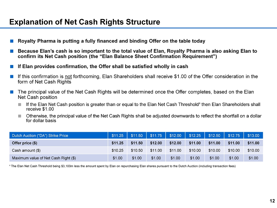 10 * Denotes a Royalty Pharma opinion 1 Assuming that the Elan Balance Sheet Confirmation Requirement is met and that no change is made to the Dutch Auction terms 2 Except in certain circumstances as defined in Appendix VIII of the Rule 2.5 announcement ■ Royalty Pharma has today announced a firm Rule 2.5 Offer for Elan at up to $12.00 per share, in cash¹ ■ Offer is fully financed, cash confirmed and not conditional on due diligence ■ Offer Price may be adjusted to no less than $11.00 per share 1,2, based on the outcome of the Dutch Auction ■ The Offer provides Elan Shareholders with the opportunity to receive a full and fair* value in cash for all of their Elan shares, the alternative is Elan’s high risk strategy* ■ Dutch Auction and takeover speculation have temporarily increased Elan share price,* but have no impact on fundamental value of Elan’s assets (cash + Tysabri Royalty) ■ Elan Shareholders are starting to vote with their feet* ■ 6 of the top 10 are net sellers below the $12.00 Offer Price, with 3 shareholders having sold 14 - 23% of their holdings ■ Even before our firm Offer, several event - driven arbs have started to take positions ■ $12.00 Offer price will be payable if Dutch Auction strike price is $11.75 or $12.00 1 ■ To obtain cash for full amount of the Offer in the shortest time frame, Elan shareholders should demand that the Elan Board immediately engage with Royalty Pharma with a view to achieving a recommended Offer Conclusion Royalty Pharma looks forward to discussing the Offer with Elan Shareholders