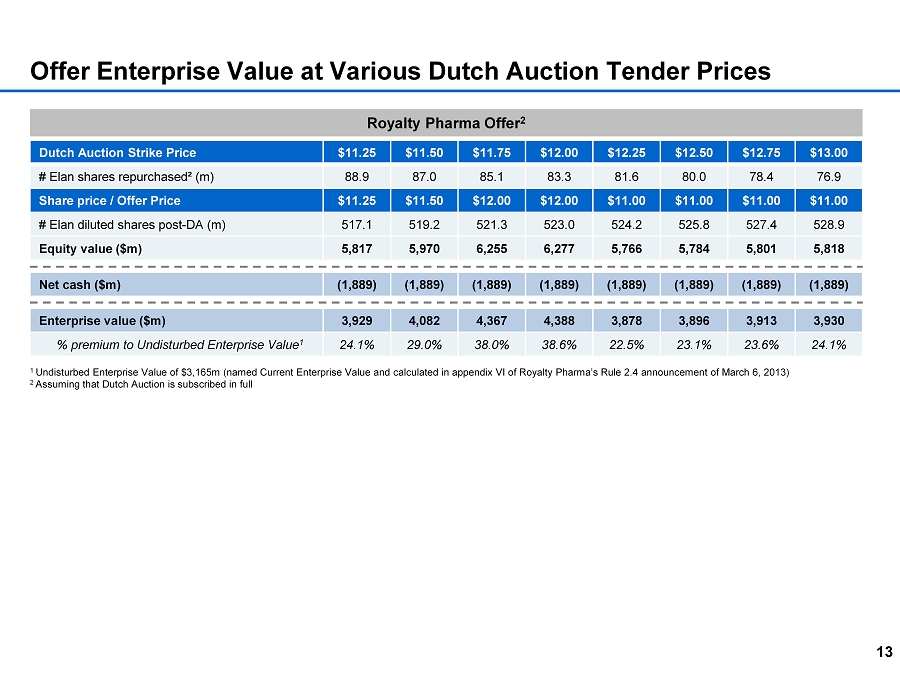 Explanation of Net Cash Rights Structure 12 ■ Royalty Pharma is putting a fully financed and binding Offer on the table today ■ Because Elan’s cash is so important to the total value of Elan, Royalty Pharma is also asking Elan to confirm its Net Cash position (the “ Elan Balance Sheet Confirmation Requirement”) ■ If Elan provides confirmation, the Offer shall be satisfied wholly in cash ■ If this confirmation is not forthcoming, Elan Shareholders shall receive $1.00 of the Offer consideration in the form of Net Cash Rights ■ The principal value of the Net Cash Rights will be determined once the Offer completes, based on the Elan Net Cash position ■ If the Elan Net Cash position is greater than or equal to the Elan Net Cash Threshold¹ then Elan Shareholders shall receive $1.00 ■ Otherwise, the principal value of the Net Cash Rights shall be adjusted downwards to reflect the shortfall on a dollar for dollar basis Dutch Auction (“DA”) Strike Price $11.25 $11.50 $11.75 $12.00 $12.25 $12.50 $12.75 $13.00 Offer price ($) $11.25 $11.50 $12.00 $12.00 $11.00 $11.00 $11.00 $11.00 Cash amount ($) $10.25 $10.50 $11.00 $11.00 $10.00 $10.00 $10.00 $10.00 Maximum value of Net Cash Right ($) $1.00 $1.00 $1.00 $1.00 $1.00 $1.00 $1.00 $1.00 ¹ The Elan Net Cash Threshold being $ 3,100 m less the amount spent by Elan on repurchasing Elan shares pursuant to the Dutch Auction (including transaction fees)