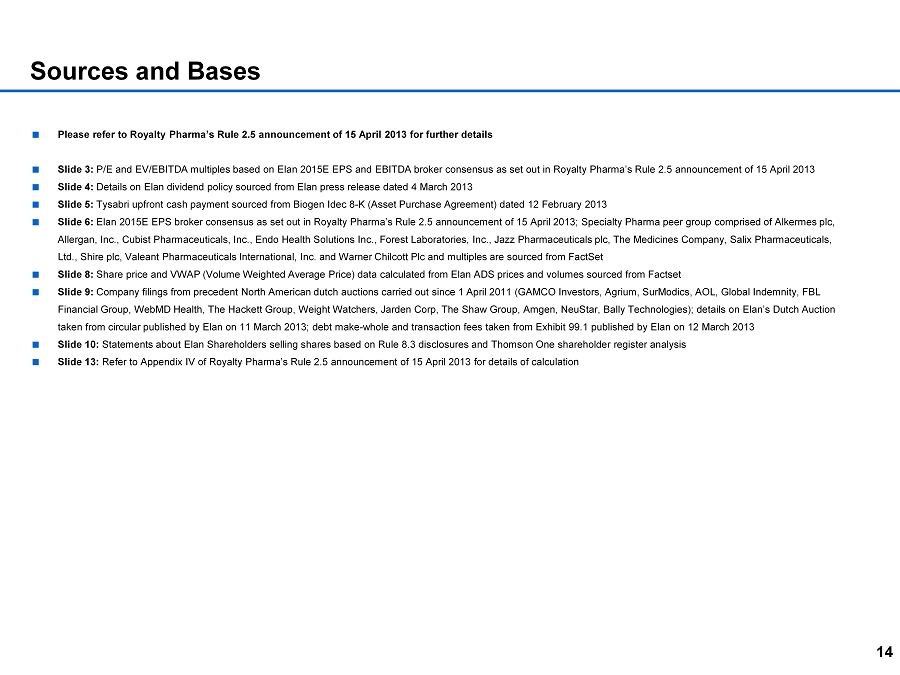 Offer Enterprise Value at Various Dutch Auction Tender Prices Dutch Auction Strike Price $11.25 $11.50 $11.75 $12.00 $12.25 $12.50 $12.75 $13.00 # Elan shares repurchased² (m) 88.9 87.0 85.1 83.3 81.6 80.0 78.4 76.9 Share price / Offer Price $11.25 $11.50 $12.00 $12.00 $11.00 $11.00 $11.00 $11.00 # Elan diluted shares post - DA (m) 517.1 519.2 521.3 523.0 524.2 525.8 527.4 528.9 Equity value ($m) 5,817 5,970 6,255 6,277 5,766 5,784 5,801 5,818 Net cash ($m) (1,889) (1,889) (1,889) (1,889) (1,889) (1,889) (1,889) (1,889) Enterprise value ($m) 3,929 4,082 4,367 4,388 3,878 3,896 3,913 3,930 % premium to Undisturbed Enterprise Value 1 24.1% 29.0% 38.0% 38.6% 22.5% 23.1% 23.6% 24.1% 13 1 Undisturbed Enterprise Value of $3,165m (named Current Enterprise Value and calculated in appendix VI of Royalty Pharma’s Rule 2.4 announcement of March 6, 2013) 2 Assuming that Dutch Auction is subscribed in full Royalty Pharma Offer 2
