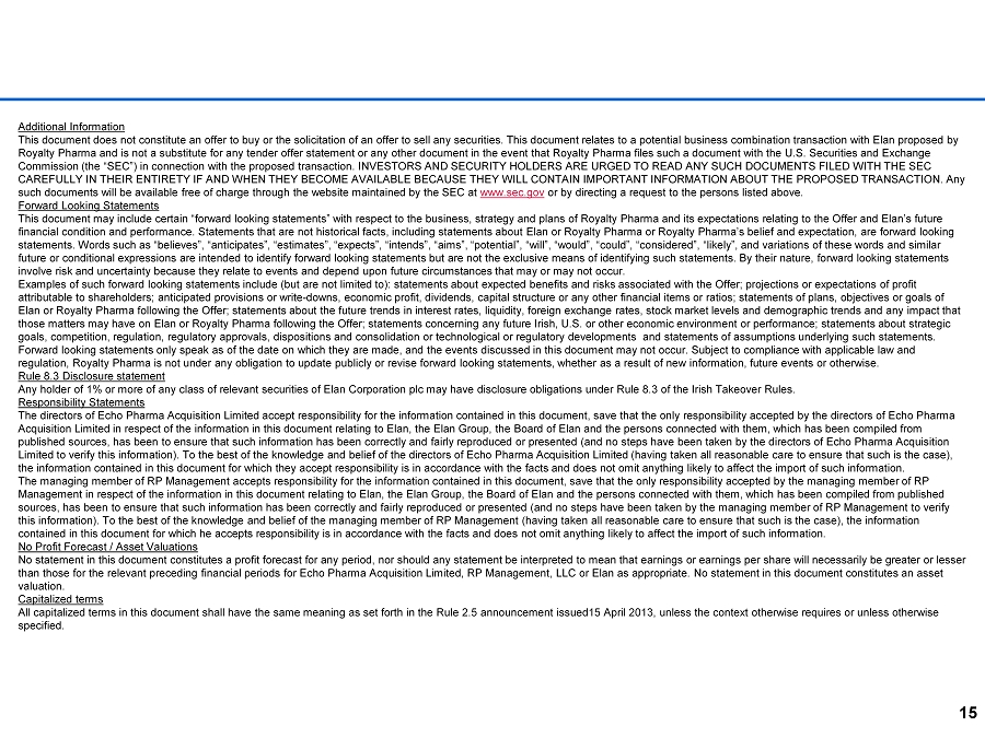 Sources and Bases 14 ■ Please refer to Royalty Pharma’s Rule 2.5 announcement of 15 April 2013 for further details ■ Slide 3: P/E and EV/EBITDA multiples based on Elan 2015E EPS and EBITDA broker consensus as set out in Royalty Pharma’s Rule 2.5 announcement of 15 April 2013 ■ Slide 4: Details on Elan dividend policy sourced from Elan press release dated 4 March 2013 ■ Slide 5: Tysabri upfront cash payment sourced from Biogen Idec 8 - K (Asset Purchase Agreement) dated 12 February 2013 ■ Slide 6: Elan 2015E EPS broker consensus as set out in Royalty Pharma’s Rule 2.5 announcement of 15 April 2013; Specialty Pharma peer group comprised of Alkermes plc, Allergan, Inc., Cubist Pharmaceuticals, Inc., Endo Health Solutions Inc., Forest Laboratories, Inc., Jazz Pharmaceuticals plc, The Medicines Company, Salix Pharmaceuticals, Ltd., Shire plc, Valeant Pharmaceuticals International, Inc. and Warner Chilcott Plc and multiples are sourced from FactSet ■ Slide 8: Share price and VWAP (Volume Weighted Average Price) data calculated from Elan ADS prices and volumes sourced from Factset ■ Slide 9: Company filings from precedent North American dutch auctions carried out since 1 April 2011 (GAMCO Investors, Agrium, SurModics, AOL, Global Indemnity, FBL Financial Group, WebMD Health, The Hackett Group, Weight Watchers, Jarden Corp, The Shaw Group, Amgen, NeuStar, Bally Technologies); details on Elan’s Dutch Auction taken from circular published by Elan on 11 March 2013; debt make - whole and transaction fees taken from Exhibit 99.1 published by Elan on 12 March 2013 ■ Slide 10: Statements about Elan Shareholders selling shares based on Rule 8.3 disclosures and Thomson One shareholder register analysis ■ Slide 13: Refer to Appendix IV of Royalty Pharma’s Rule 2.5 announcement of 15 April 2013 for details of calculation