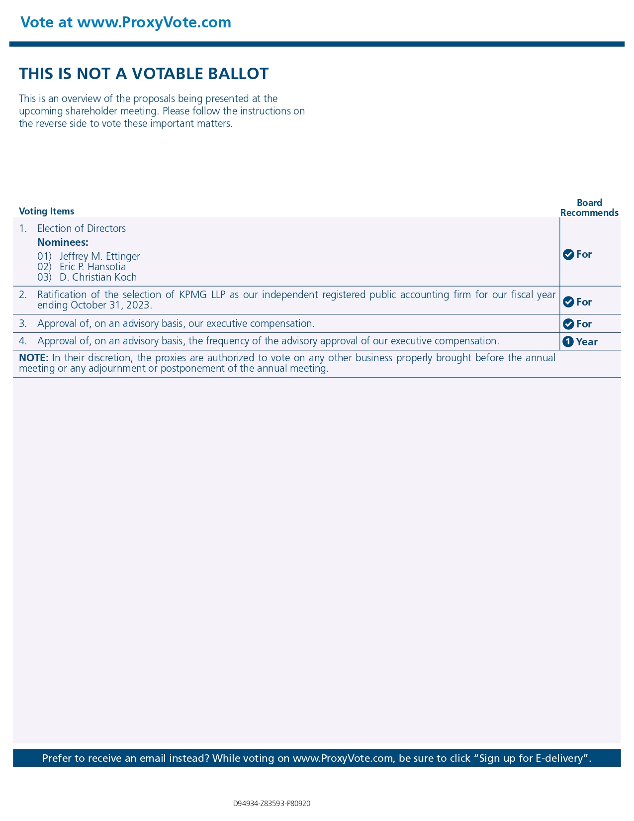 Vote at www.ProxyVote.com THIS IS NOT A VOTABLE BALLOT This is an overview of the proposals being presented at the upcoming shareholder meeting. Please follow the instructions on the reverse side to vote these important matters. Board Recommends Voting Items 1. Election of Directors Nominees: For 01) Jeffrey M. Ettinger 02) Eric P. Hansotia 03) D. Christian Koch 2. Ratification of the selection of KPMG LLP as our independent registered public accounting firm for our fiscal year ending October 31, 2023. For 3. Approval of, on an advisory basis, our executive compensation. For 4. Approval of, on an advisory basis, the frequency of the advisory approval of our executive compensation. Year 1 NOTE: In their discretion, the proxies are authorized to vote on any other business properly brought before the annual meeting or any adjournment or postponement of the annual meeting. Prefer to receive an email instead? While voting on www.ProxyVote.com, be sure to click “Sign up for E-delivery”. D94934-Z83593-P80920