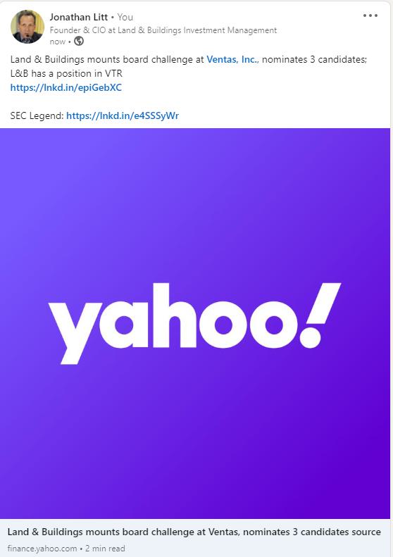 On January 11, 2024, Jonathan Litt of Land & Buildings issued the following statements on social media, each of which included a link to an article published by Reuters, which can be found at https://finance.yahoo.com/news/land-buildings-mounts-board-challenge-120000064.html: