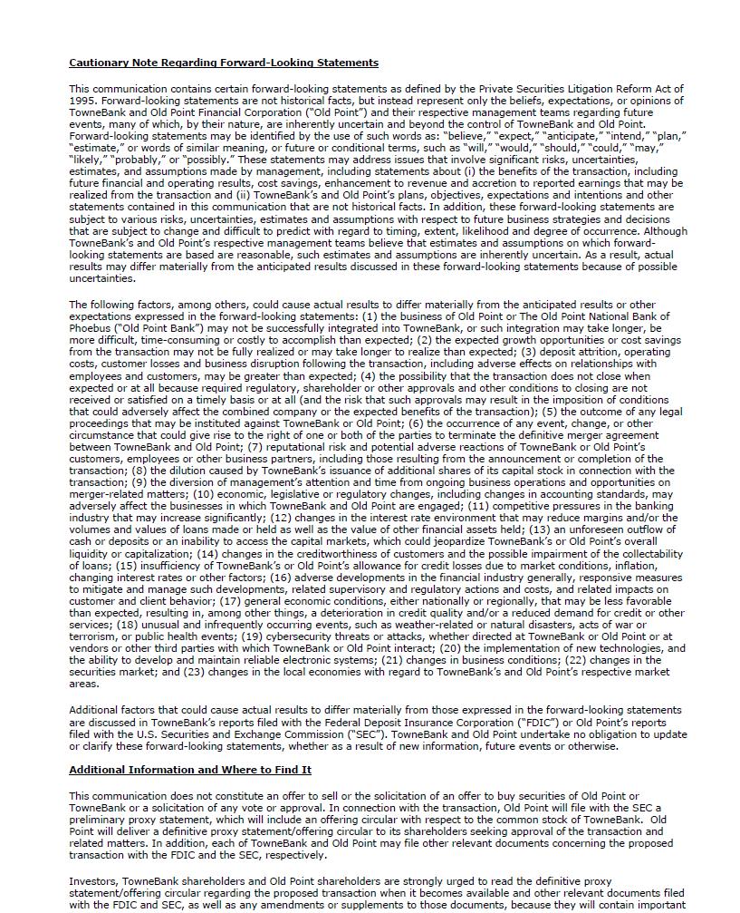 Cautionary Note Regarding Forward-Looking Statements This communication contains certain forward-looking statements as defined by the Private Securities Litigation Reform Act of 1995. Forward-looking statements are not historical facts, but instead represent only the beliefs, expectations, or opinions of TowneBank and Old Point Financial Corporation (“Old Point”) and their respective management teams regarding future events, many of which, by their nature, are inherently uncertain and beyond the control of TowneBank and Old Point. Forward-looking statements may be identified by the use of such words as: “believe,” “expect,” “anticipate,” “intend,” “plan,” “estimate,” or words of similar meaning, or future or conditional terms, such as “will,” “would,” “should,” “could,” “may,” “likely,” “probably,” or “possibly.” These statements may address issues that involve significant risks, uncertainties, estimates, and assumptions made by management, including statements about (i) the benefits of the transaction, including future financial and operating results, cost savings, enhancement to revenue and accretion to reported earnings that may be realized from the transaction and (ii) TowneBank’s and Old Point’s plans, objectives, expectations and intentions and other statements contained in this communication that are not historical facts. In addition, these forward-looking statements are subject to various risks, uncertainties, estimates and assumptions with respect to future business strategies and decisions that are subject to change and difficult to predict with regard to timing, extent, likelihood and degree of occurrence. Although TowneBank’s and Old Point’s respective management teams believe that estimates and assumptions on which forwardlooking statements are based are reasonable, such estimates and assumptions are inherently uncertain. As a result, actual results may differ materially from the anticipated results discussed in these forward-looking statements because of possible uncertainties. The following factors, among others, could cause actual results to differ materially from the anticipated results or other expectations expressed in the forward-looking statements: (1) the business of Old Point or The Old Point National Bank of Phoebus (“Old Point Bank”) may not be successfully integrated into TowneBank, or such integration may take longer, be more difficult, time-consuming or costly to accomplish than expected; (2) the expected growth opportunities or cost savings from the transaction may not be fully realized or may take longer to realize than expected; (3) deposit attrition, operating costs, customer losses and business disruption following the transaction, including adverse effects on relationships with employees and customers, may be greater than expected; (4) the possibility that the transaction does not close when expected or at all because required regulatory, shareholder or other approvals and other conditions to closing are not received or satisfied on a timely basis or at all (and the risk that such approvals may result in the imposition of conditions that could adversely affect the combined company or the expected benefits of the transaction); (5) the outcome of any legal proceedings that may be instituted against TowneBank or Old Point; (6) the occurrence of any event, change, or other circumstance that could give rise to the right of one or both of the parties to terminate the definitive merger agreement between TowneBank and Old Point; (7) reputational risk and potential adverse reactions of TowneBank or Old Point’s customers, employees or other business partners, including those resulting from the announcement or completion of the transaction; (8) the dilution caused by TowneBank’s issuance of additional shares of its capital stock in connection with the transaction; (9) the diversion of management’s attention and time from ongoing business operations and opportunities on merger-related matters; (10) economic, legislative or regulatory changes, including changes in accounting standards, may adversely affect the businesses in which TowneBank and Old Point are engaged; (11) competitive pressures in the banking industry that may increase significantly; (12) changes in the interest rate environment that may reduce margins and/or the volumes and values of loans made or held as well as the value of other financial assets held; (13) an unforeseen outflow of cash or deposits or an inability to access the capital markets, which could jeopardize TowneBank’s or Old Point’s overall liquidity or capitalization; (14) changes in the creditworthiness of customers and the possible impairment of the collectability of loans; (15) insufficiency of TowneBank’s or Old Point’s allowance for credit losses due to market conditions, inflation, changing interest rates or other factors; (16) adverse developments in the financial industry generally, responsive measures to mitigate and manage such developments, related supervisory and regulatory actions and costs, and related impacts on customer and client behavior; (17) general economic conditions, either nationally or regionally, that may be less favorable than expected, resulting in, among other things, a deterioration in credit quality and/or a reduced demand for credit or other services; (18) unusual and infrequently occurring events, such as weather-related or natural disasters, acts of war or terrorism, or public health events; (19) cybersecurity threats or attacks, whether directed at TowneBank or Old Point or at vendors or other third parties with which TowneBank or Old Point interact; (20) the implementation of new technologies, and the ability to develop and maintain reliable electronic systems; (21) changes in business conditions; (22) changes in the securities market; and (23) changes in the local economies with regard to TowneBank’s and Old Point