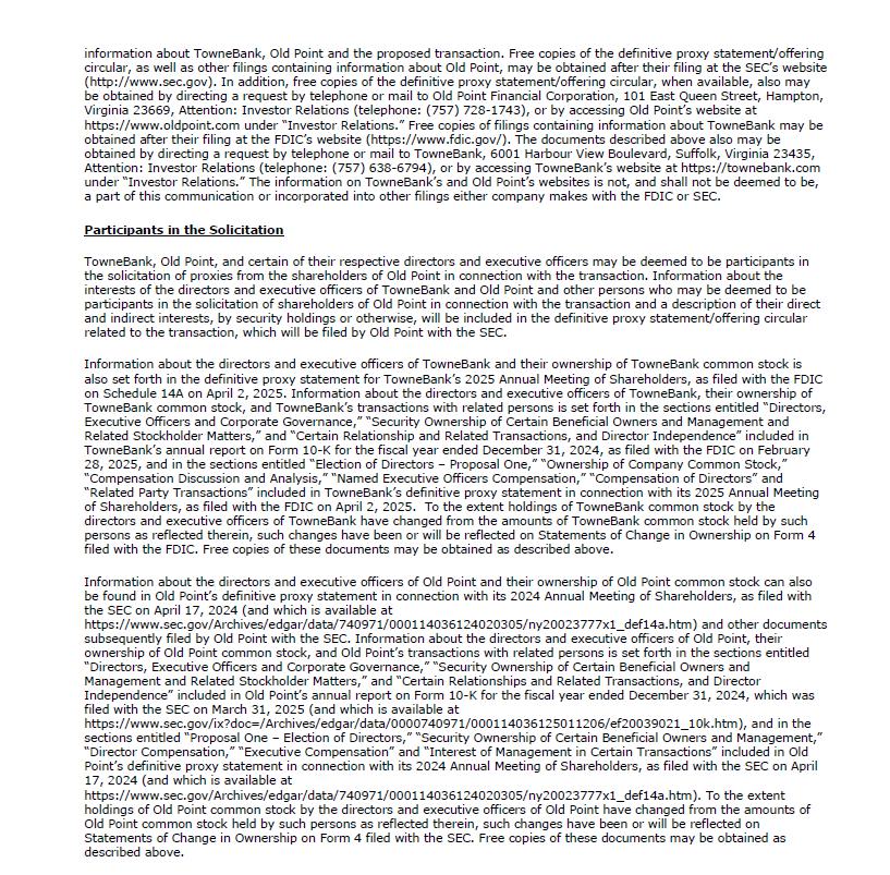 information about TowneBank, Old Point and the proposed transaction. Free copies of the definitive proxy statement/offering circular, as well as other filings containing information about Old Point, may be obtained after their filing at the SEC’s website (http://www.sec.gov). In addition, free copies of the definitive proxy statement/offering circular, when available, also may be obtained by directing a request by telephone or mail to Old Point Financial Corporation, 101 East Queen Street, Hampton, Virginia 23669, Attention: Investor Relations (telephone: (757) 728-1743), or by accessing Old Point’s website at https://www.oldpoint.com under “Investor Relations.” Free copies of filings containing information about TowneBank may be obtained after their filing at the FDIC’s website (https://www.fdic.gov/). The documents described above also may be obtained by directing a request by telephone or mail to TowneBank, 6001 Harbour View Boulevard, Suffolk, Virginia 23435, Attention: Investor Relations (telephone: (757) 638-6794), or by accessing TowneBank’s website at https://townebank.com under “Investor Relations.” The information on TowneBank’s and Old Point’s websites is not, and shall not be deemed to be, a part of this communication or incorporated into other filings either company makes with the FDIC or SEC. Participants in the Solicitation TowneBank, Old Point, and certain of their respective directors and executive officers may be deemed to be participants in the solicitation of proxies from the shareholders of Old Point in connection with the transaction. Information about the interests of the directors and executive officers of TowneBank and Old Point and other persons who may be deemed to be participants in the solicitation of shareholders of Old Point in connection with the transaction and a description of their direct and indirect interests, by security holdings or otherwise, will be included in the definitive proxy statement/offering circular related to the transaction, which will be filed by Old Point with the SEC. Information about the directors and executive officers of TowneBank and their ownership of TowneBank common stock is also set forth in the definitive proxy statement for TowneBank’s 2025 Annual Meeting of Shareholders, as filed with the FDIC on Schedule 14A on April 2, 2025. Information about the directors and executive officers of TowneBank, their ownership of TowneBank common stock, and TowneBank’s transactions with related persons is set forth in the sections entitled “Directors, Executive Officers and Corporate Governance,” “Security Ownership of Certain Beneficial Owners and Management and Related Stockholder Matters,” and “Certain Relationship and Related Transactions, and Director Independence” included in TowneBank’s annual report on Form 10-K for the fiscal year ended December 31, 2024, as filed with the FDIC on February 28, 2025, and in the sections entitled “Election of Directors – Proposal One,” “Ownership of Company Common Stock,” “Compensation Discussion and Analysis,” “Named Executive Officers Compensation,” “Compensation of Directors” and “Related Party Transactions” included in TowneBank’s definitive proxy statement in connection with its 2025 Annual Meeting of Shareholders, as filed with the FDIC on April 2, 2025. To the extent holdings of TowneBank common stock by the directors and executive officers of TowneBank have changed from the amounts of TowneBank common stock held by such persons as reflected therein, such changes have been or will be reflected on Statements of Change in Ownership on Form 4 filed with the FDIC. Free copies of these documents may be obtained as described above. Information about the directors and executive officers of Old Point and their ownership of Old Point common stock can also be found in Old Point’s definitive proxy statement in connection with its 2024 Annual Meeting of Shareholders, as filed with the SEC on April 17, 2024 (and which is available at https://www.sec.gov/Archives/edgar/data/740971/000114036124020305/ny20023777x1_def14a.htm) and other documents subsequently filed by Old Point with the SEC. Information about the directors and executive officers of Old Point, their ownership of Old Point common stock, and Old Point’s transactions with related persons is set forth in the sections entitled “Directors, Executive Officers and Corporate Governance,” “Security Ownership of Certain Beneficial Owners and Management and Related Stockholder Matters,” and “Certain Relationships and Related Transactions, and Director Independence” included in Old Point’s annual report on Form 10-K for the fiscal year ended December 31, 2024, which was filed with the SEC on March 31, 2025 (and which is available at https://www.sec.gov/ix?doc=/Archives/edgar/data/0000740971/000114036125011206/ef20039021_10k.htm), and in the sections entitled “Proposal One – Election of Directors,” “Security Ownership of Certain Beneficial Owners and Management,” “Director Compensation,” “Executive Compensation” and “Interest of Management in Certain Transactions” included in Old Point’s definitive proxy statement in connection with its 2024 Annual Meeting of Shareholders, as filed with the SEC on April 17, 2024 (and which is available at https://www.sec.gov/Archives/edgar/data/740971/000114036124020305/ny20023777x1_def14a.htm). To the extent holdings of Old Point common stock by the directors and executive officers of Old Point have changed from the amounts of Old Point common stock held by such persons as reflected therein, such changes have been or will be reflected on Statements of Change in Ownership on Form 4 filed with the SEC. Free copies of these documents may be obtained as described above.
