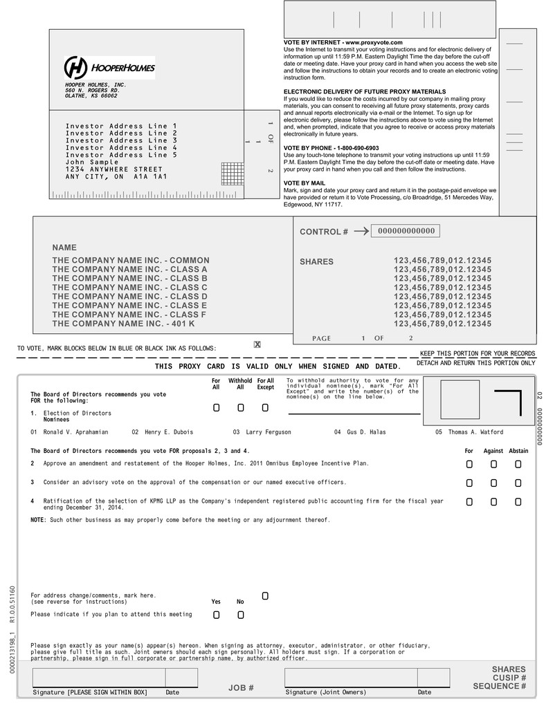 • | Approve the amendment and restatement of the Hooper Holmes, Inc. 2011 Omnibus Employee Incentive Plan (Proposal 2); |