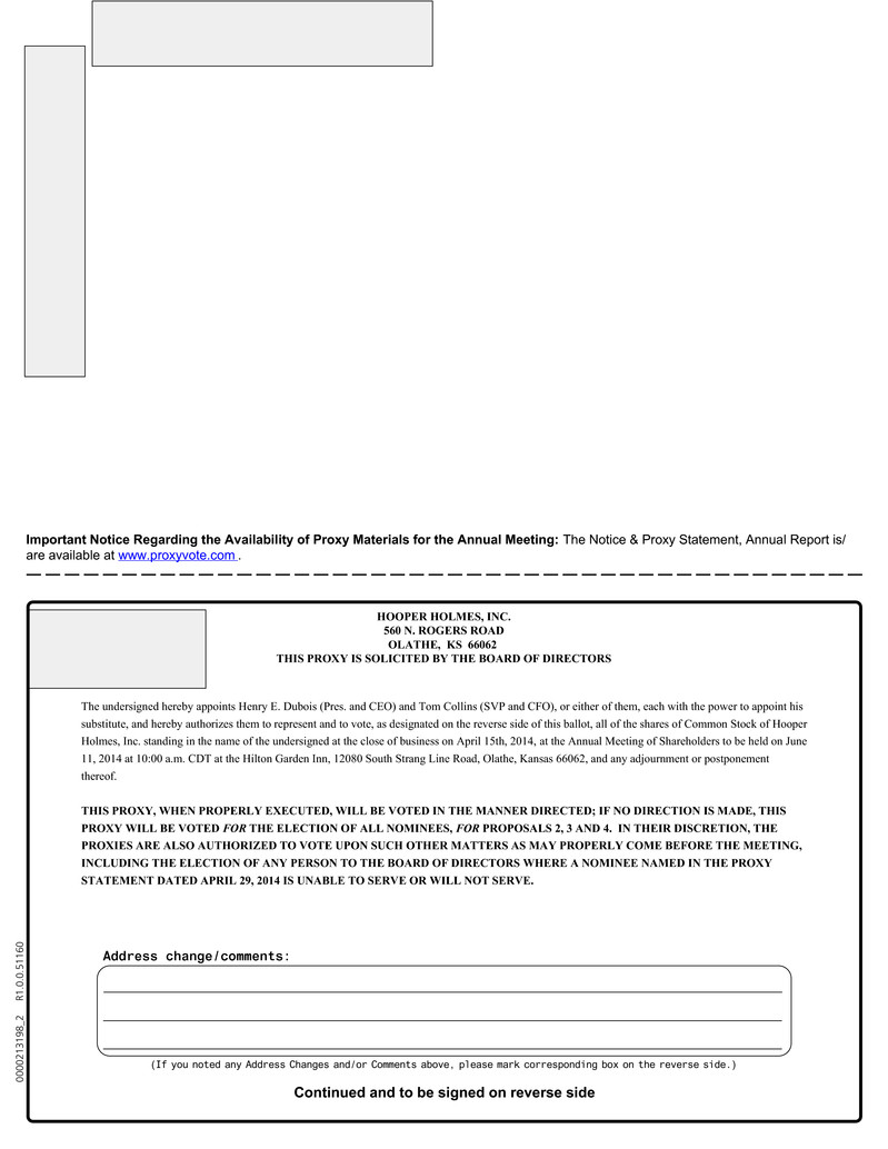 The annual meeting of shareholders of Hooper Holmes, Inc. will be held at 10:00 a.m. (Central Time) on Wednesday, June 11, 2014 at the Hilton Garden Inn, 12080 South Strang Line Road, Olathe, Kansas 66062, for the following purposes: