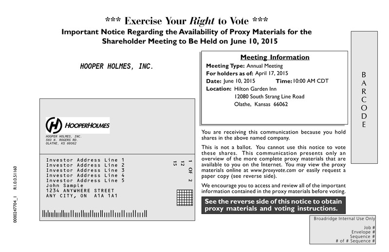 The annual meeting of shareholders of Hooper Holmes, Inc. will be held at 10:00 a.m. (Central Time) on Wednesday, June 10, 2015 at the Hilton Garden Inn, 12080 South Strang Line Road, Olathe, Kansas 66062, for the following purposes: