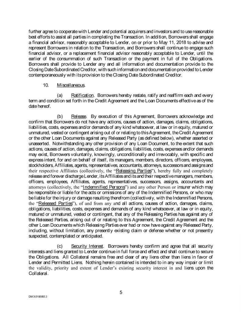 further agree to cooperate with Lender and potential acquirers and investors and to use reasonable best efforts to assist all parties in completing the Transaction. In addition, Borrowers shall engage a financial advisor, reasonably acceptable to Lender, on or prior to May 11, 2018 to advise and represent Borrowers in relation to the Transaction, and Borrowers shall continue to engage such financial advisor, or a replacement financial advisor reasonably acceptable to Lender, until the earlier of the consummation of such Transaction or the payment in full of the Obligations. Borrowers shall provide to Lender any and all information and documentation provide to the Closing Date Subordinated Creditor, with such information and documentation provided to Lender contemporaneously with its provision to the Closing Date Subordinated Creditor. 10. Miscellaneous. (a) Ratification. Borrowers hereby restate, ratify and reaffirm each and every term and condition set forth in the Credit Agreement and the Loan Documents effective as of the date hereof. (b) Release. By execution of this Agreement, Borrowers acknowledge and confirm that Borrowers do not have any actions, causes of action, damages, claims, obligations, liabilities, costs, expenses and/or demands of any kind whatsoever, at law or in equity, matured or unmatured, vested or contingent arising out of or relating to this Agreement, the Credit Agreement or the other Loan Documents against any Released Party (as defined below), whether asserted or unasserted. Notwithstanding any other provision of any Loan Document, to the extent that such actions, causes of action, damages, claims, obligations, liabilities, costs, expenses and/or demands may exist, Borrowers voluntarily, knowingly, unconditionally and irrevocably, with specific and express intent, for and on behalf of itself, its managers, members, directors, officers, employees, stockholders, Affiliates, agents, representatives, accountants, attorneys, successors and assigns and their respective Affiliates (collectively, the “Releasing Parties”), hereby fully and completely release and forever discharge Lender, its Affiliates and its and their respective managers, members, officers, employees, Affiliates, agents, representatives, successors, assigns, accountants and attorneys (collectively, the “Indemnified Persons”) and any other Person or insurer which may be responsible or liable for the acts or omissions of any of the Indemnified Persons, or who may be liable for the injury or damage resulting therefrom (collectively, with the Indemnified Persons, the “Released Parties”), of and from any and all actions, causes of action, damages, claims, obligations, liabilities, costs, expenses and demands of any kind whatsoever, at law or in equity, matured or unmatured, vested or contingent, that any of the Releasing Parties has against any of the Released Parties, arising out of or relating to this Agreement, the Credit Agreement and the other Loan Documents which Releasing Parties ever had or now have against any Released Party, including, without limitation, any presently existing claim or defense whether or not presently suspected, contemplated or anticipated. (c) Security Interest. Borrowers hereby confirm and agree that all security interests and liens granted to Lender continue in full force and effect and shall continue to secure the Obligations. All Collateral remains free and clear of any liens other than liens in favor of Lender and Permitted Liens. Nothing herein contained is intended to in any way impair or limit the validity, priority and extent of Lender’s existing security interest in and liens upon the Collateral. 5 DM3\5190965.3