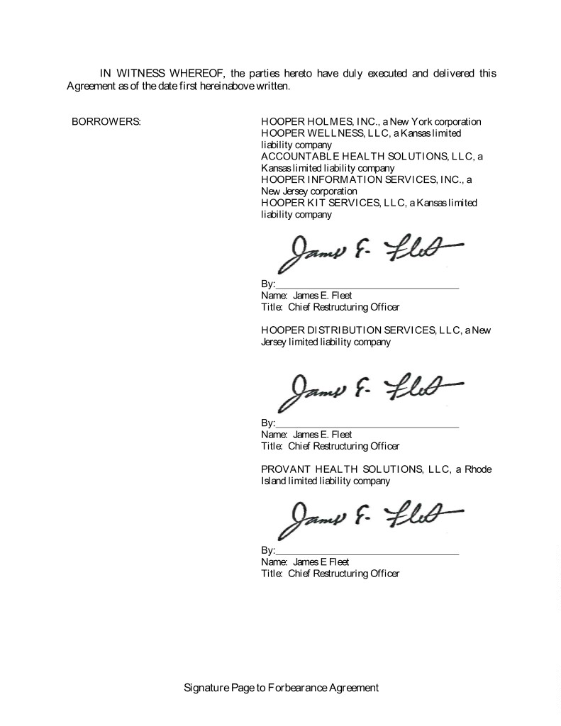 IN WITNESS WHEREOF, the parties hereto have duly executed and delivered this Agreement as of the date first hereinabove written. BORROWERS: HOOPER HOLMES, INC., a New York corporation HOOPER WELLNESS, LLC, a Kansas limited liability company ACCOUNTABLE HEALTH SOLUTIONS, LLC, a Kansas limited liability company HOOPER INFORMATION SERVICES, INC., a New Jersey corporation HOOPER KIT SERVICES, LLC, a Kansas limited liability company By: Name: James E. Fleet Title: Chief Restructuring Officer HOOPER DISTRIBUTION SERVICES, LLC, a New Jersey limited liability company By: Name: James E. Fleet Title: Chief Restructuring Officer PROVANT HEALTH SOLUTIONS, LLC, a Rhode Island limited liability company By: Name: James E Fleet Title: Chief Restructuring Officer Signature Page to Forbearance Agreement
