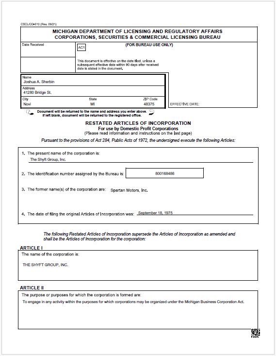 Telephone Number (313) 225-7003 INFORMATION AND INSTRUCTIONS 1. This form may be used to draft your Restated Articles of Incorporation. A document required or permitted to be filed under the act cannot be filed unless it contains the