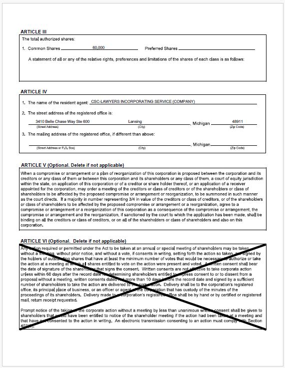 agent. 10. FEES: Make remittance payable to the State of Michigan. Include corporation name on check or money order. NONREFUNDABLE FEE $10.00 ADDITIONAL FEES DUE FOR INCREASED AUTHORIZED SHARES OF PROFIT CORPORATIONS ARE: Amount of