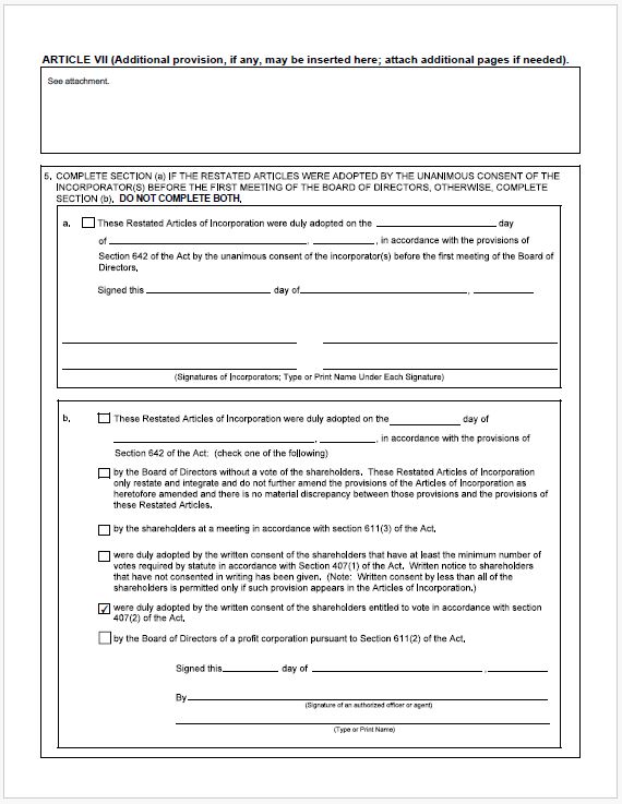 purposes. 6. Item 5 - Restated Articles of Incorporation submitted before the first meeting of the Board of Directors may be adopted by all of the incorporators by completing Item 5(a). Restated Articles of Incorporation which do not