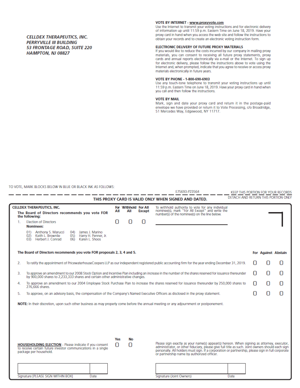 VOTE BY INTERNET - www.proxyvote.com Use the Internet to transmit your voting instructions and for electronic delivery of information up until 11:59 p.m. Eastern Time on June 18, 2019. Have your proxy card in hand when you access the web site and follow the instructions to obtain your records and to create an electronic voting instruction form. CELLDEX THERAPEUTICS, INC. PERRYVILLE III BUILDING 53 FRONTAGE ROAD, SUITE 220 HAMPTON, NJ 08827 ELECTRONIC DELIVERY OF FUTURE PROXY MATERIALS If you would like to reduce the costs incurred by our company in mailing proxy materials, you can consent to receiving all future proxy statements, proxy cards and annual reports electronically via e-mail or the Internet. To sign up for electronic delivery, please follow the instructions above to vote using the Internet and, when prompted, indicate that you agree to receive or access proxy materials electronically in future years. VOTE BY PHONE - 1-800-690-6903 Use any touch-tone telephone to transmit your voting instructions up until 11:59 p.m. Eastern Time on June 18, 2019. Have your proxy card in hand when you call and then follow the instructions. VOTE BY MAIL Mark, sign and date your proxy card and return it in the postage-paid envelope we have provided or return it to Vote Processing, c/o Broadridge, 51 Mercedes Way, Edgewood, NY 11717. TO VOTE, MARK BLOCKS BELOW IN BLUE OR BLACK INK AS FOLLOWS: E75693-P23564 KEEP THIS PORTION FOR YOUR RECORDS DETACH AND RETURN THIS PORTION ONLY THIS PROXY CARD IS VALID ONLY WHEN SIGNED AND DATED. CELLDEX THERAPEUTICS, INC. The Board of Directors recommends you vote FOR the following: For Withhold For All AllAllExcept To withhold authority to vote for any individual nominee(s), mark "For All Except" and write the number(s) of the nominee(s) on the line below. ! !! 1. Election of Directors Nominees: 01) Anthony S. Marucci 02) Keith L. Brownlie 03) Herbert J. Conrad 04) James J. Marino 05) Harry H. Penner, Jr. 06) Karen L. Shoos The Board of Directors recommends you vote FOR proposals 2, 3, 4 and 5. For Against Abstain ! ! ! ! ! ! ! ! ! ! ! ! 2. To ratify the appointment of PricewaterhouseCoopers LLP as our independent registered public accounting firm for the year ending December 31, 2019. 3. To approve an amendment to our 2008 Stock Option and Incentive Plan including an increase in the number of the shares reserved for issuance thereunder by 900,000 shares to 2,233,333 shares and certain other administrative changes. To approve an amendment to our 2004 Employee Stock Purchase Plan to increase the shares reserved for issuance thereunder by 250,000 shares to 276,666 shares. To approve, on an advisory basis, the compensation of the Company's Named Executive Officers as disclosed in the proxy statement. 4. 5. NOTE: In their discretion, upon such other business as may properly come before the annual meeting or any adjournment or postponement. Yes ! No ! Please sign exactly as your name(s) appear(s) hereon. When signing as attorney, executor, administrator, or other fiduciary, please give full title as such. Joint owners should each sign personally. All holders must sign. If a corporation or partnership, please sign in full corporate or partnership name by authorized officer. HOUSEHOLDING ELECTION - Please indicate if you consent to receive certain future investor communications in a single package per household. Signature [PLEASE SIGN WITHIN BOX] Date Signature (Joint Owners) Date