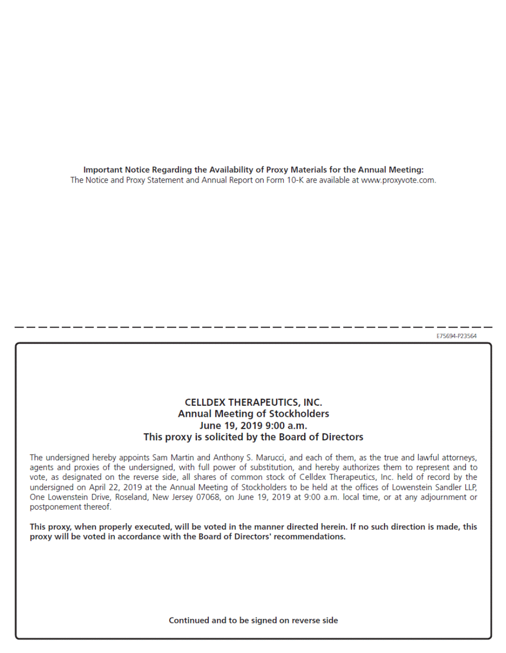 Important Notice Regarding the Availability of Proxy Materials for the Annual Meeting: The Notice and Proxy Statement and Annual Report on Form 10-K are available at www.proxyvote.com. E75694-P23564 CELLDEX THERAPEUTICS, INC. Annual Meeting of Stockholders June 19, 2019 9:00 a.m. This proxy is solicited by the Board of Directors The undersigned hereby appoints Sam Martin and Anthony S. Marucci, and each of them, as the true and lawful attorneys, agents and proxies of the undersigned, with full power of substitution, and hereby authorizes them to represent and to vote, as designated on the reverse side, all shares of common stock of Celldex Therapeutics, Inc. held of record by the undersigned on April 22, 2019 at the Annual Meeting of Stockholders to be held at the offices of Lowenstein Sandler LLP, One Lowenstein Drive, Roseland, New Jersey 07068, on June 19, 2019 at 9:00 a.m. local time, or at any adjournment or postponement thereof. This proxy, when properly executed, will be voted in the manner directed herein. If no such direction is made, this proxy will be voted in accordance with the Board of Directors' recommendations. Continued and to be signed on reverse side