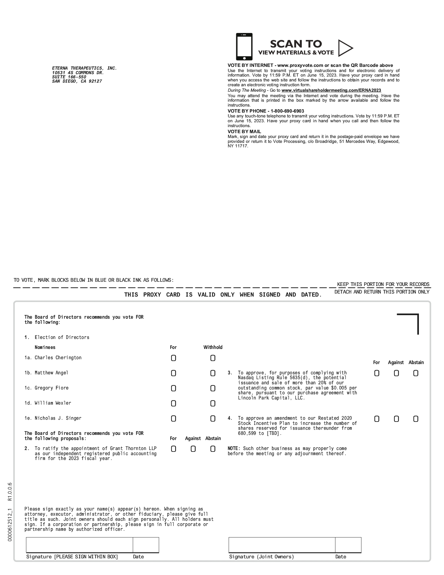 You may submit a question at any time during the meeting by visiting virtualshareholdermeeting.com/ERNA2023. The Chairman of the meeting has broad authority to conduct the Annual Meeting in an orderly manner, including establishing rules of conduct. A replay of the Annual Meeting will be available on our website at https://www.eternatx.com after the meeting.
