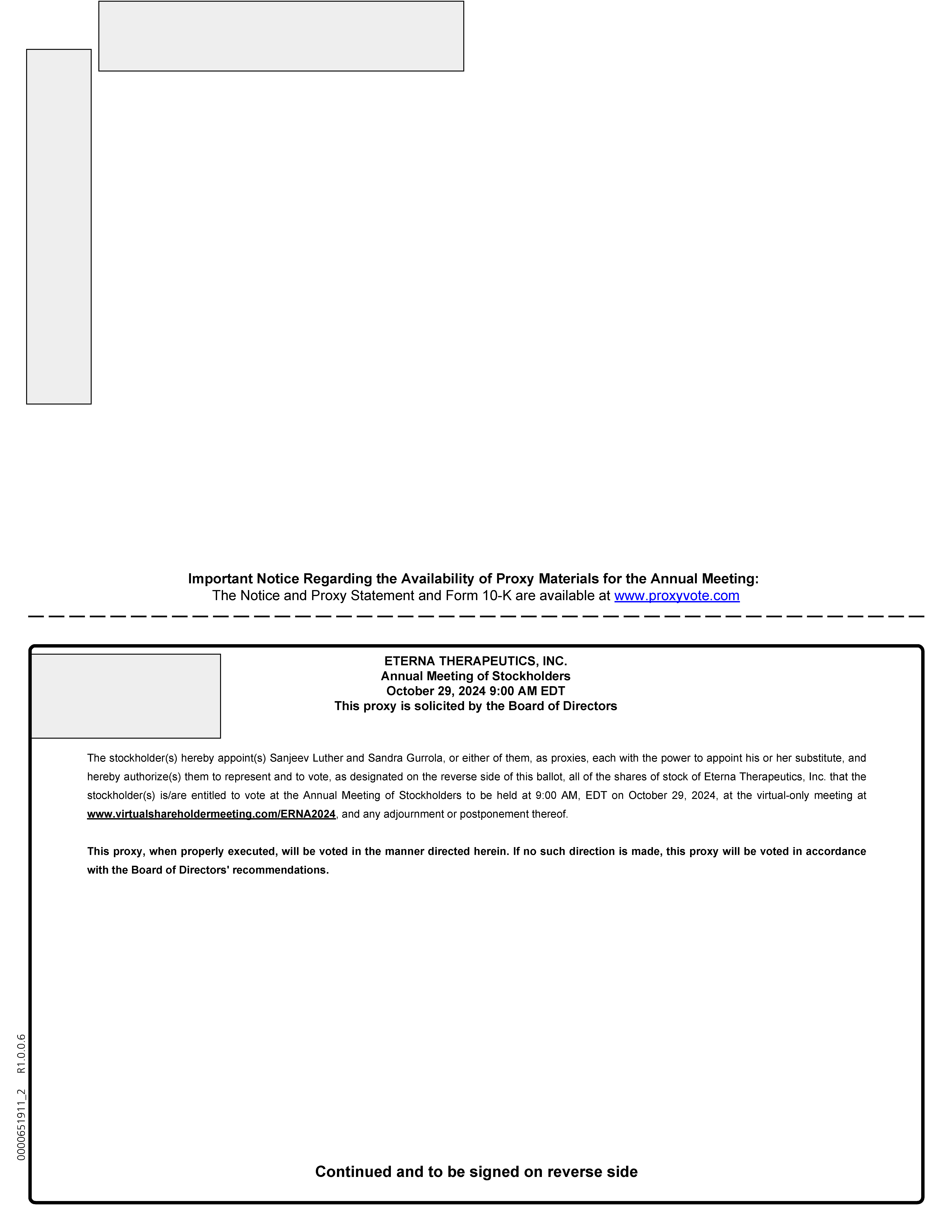 NOTICE IS HEREBY GIVEN that the 2024 annual meeting of stockholders of Eterna Therapeutics Inc., a Delaware corporation, is scheduled to be held on October 29, 2024, at 9:00 a.m. Eastern Time for the following purposes, which are more fully described in the accompanying proxy statement: