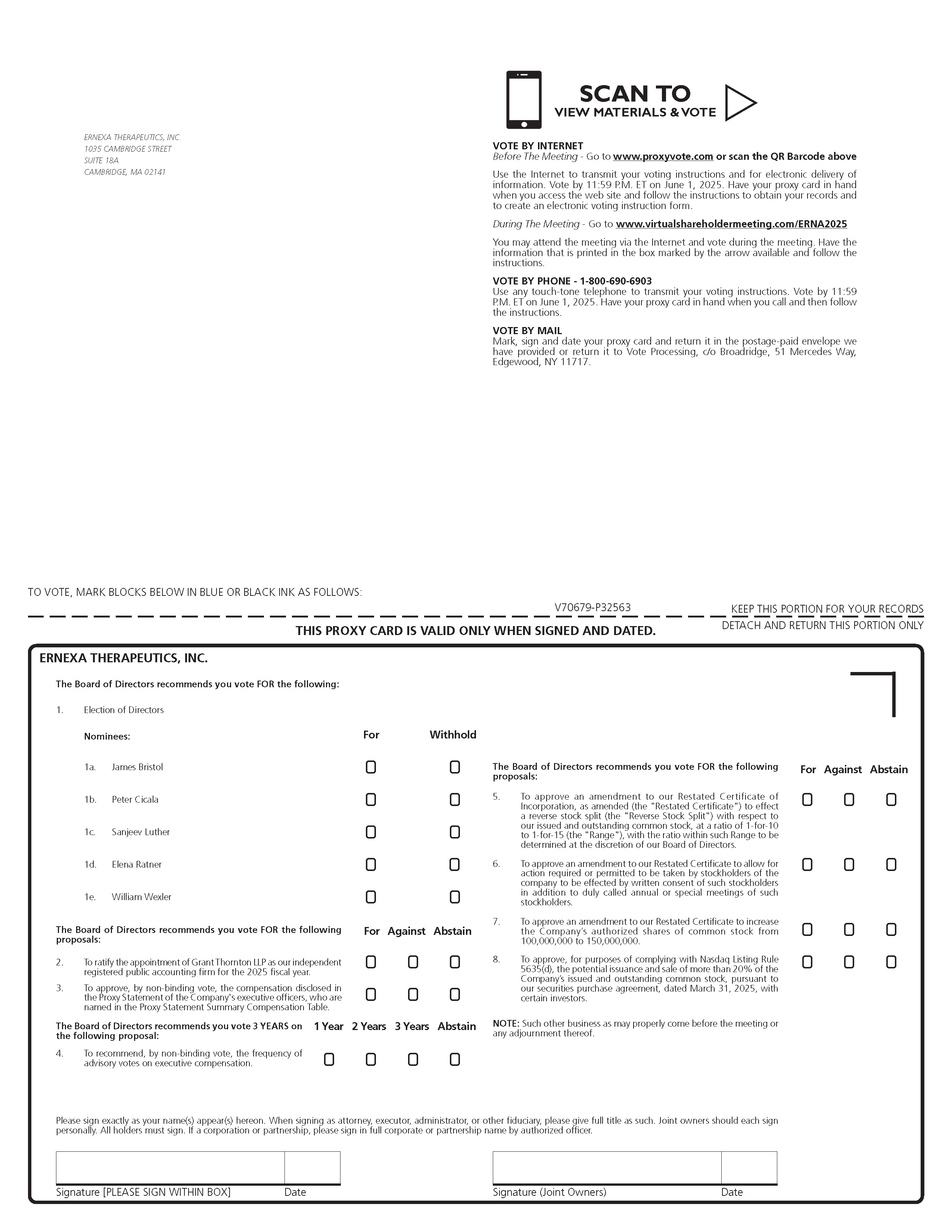 NOTICE IS HEREBY GIVEN that the 2025 annual meeting of stockholders of Ernexa Therapeutics Inc., a Delaware corporation, is scheduled to be held on June 2, 2025, at 11:00 a.m. Eastern Time for the following purposes, which are more fully described in the accompanying proxy statement: