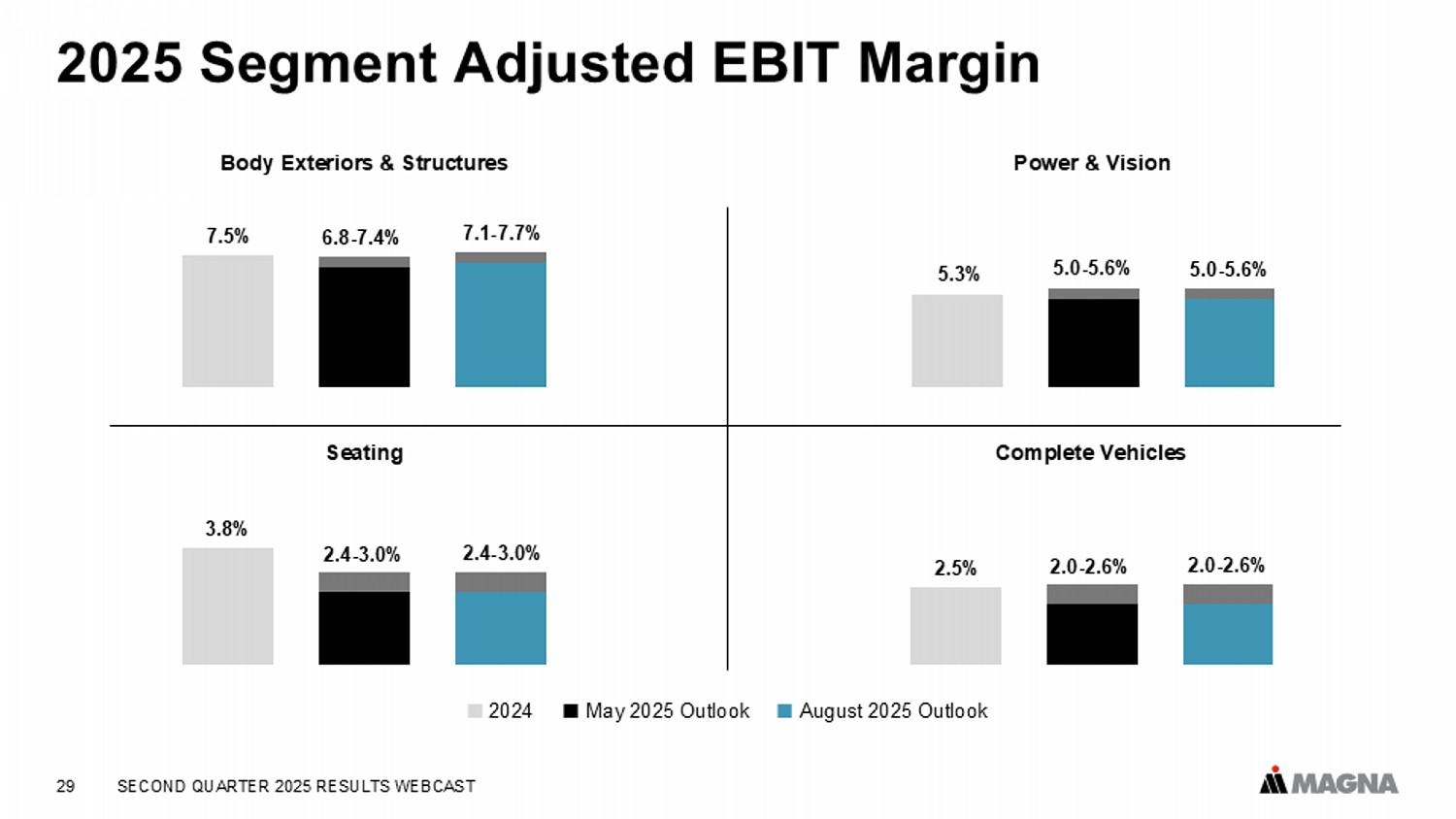 SECOND QUARTER 2025 RESULTS WEBCAST 29 2025 Segment Adjusted EBIT Margin 2024 May 2025 Outlook August 2025 Outlook Seating Body Exteriors & Structures Power & Vision Complete Vehicles 7.5% 6.8 - 7.4% 5.3% 5.0 - 5.6% 3.8% 2.4 - 3.0% 2.5% 2.0 - 2.6% 7.1 - 7.7% 2.4 - 3.0% 5.0 - 5.6% 2.0 - 2.6%