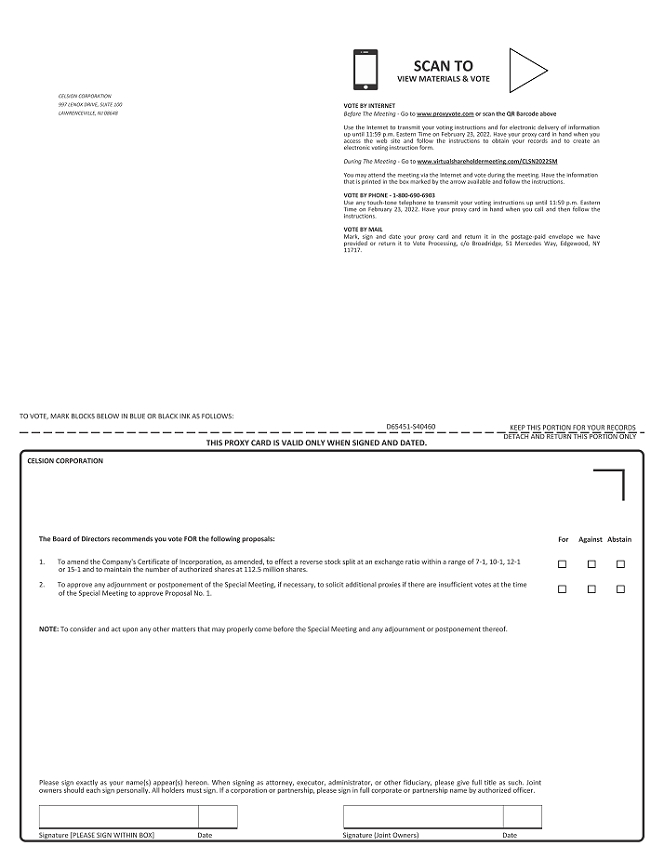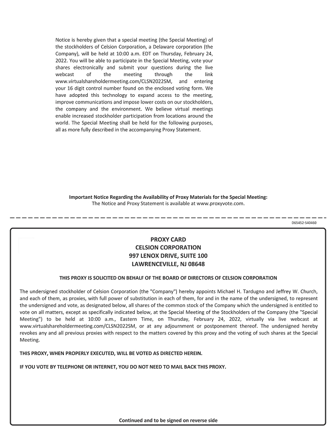Notice is hereby given that a special meeting (the “Special Meeting”) of the stockholders of Celsion Corporation, a Delaware corporation (the “Company”), will be held at 10:00 a.m., local time, on Thursday, February 24, 2022. You will be able to attend the Special Meeting, vote, and submit your questions during the meeting via live webcast through the link www.virtualshareholdermeeting.com/CLSN2022SM and entering your 16-digit control number included on your proxy card or in the instructions that accompanied your proxy materials. We have adopted this technology to expand access to the meeting, improve communications and impose lower costs on our stockholders, the Company and the environment. We believe virtual meetings enable increased stockholder participation from locations around the world. Additionally, given the heightened concerns around COVID-19, the virtual meeting format allows us to continue to proceed with the meeting while mitigating the potential health and safety risks to participants. The Special Meeting shall be held for the following purpose, all as more fully described in the accompanying Proxy Statement: