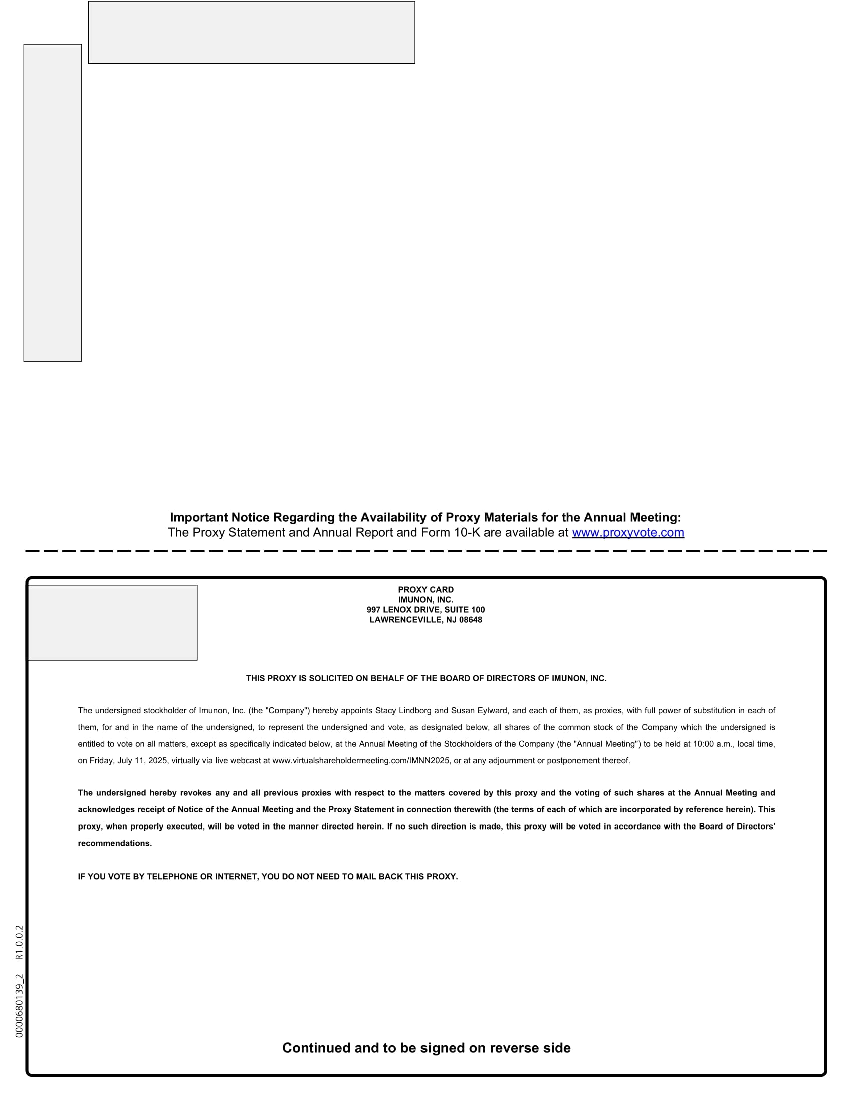 ADDITIONALLY, YOU CAN FIND A COPY OF OUR ANNUAL REPORT ON FORM 10-K, WHICH INCLUDES OUR FINANCIAL STATEMENTS, FOR THE FISCAL YEAR ENDED DECEMBER 31, 2024, ON THE WEBSITE OF THE SECURITIES AND EXCHANGE COMMISSION (THE “SEC”) AT WWW.SEC.GOV, OR UNDER “FINANCIAL INFORMATION” IN THE “NEWS AND INVESTORS” SECTION OF OUR WEBSITE AT WWW.IMUNON.COM. YOU MAY ALSO OBTAIN A PRINTED COPY OF OUR ANNUAL REPORT ON FORM 10-K, INCLUDING OUR FINANCIAL STATEMENTS, FREE OF CHARGE, FROM US BY SENDING A WRITTEN REQUEST TO: IMUNON, INC, 997 LENOX DRIVE, SUITE 100, LAWRENCEVILLE, NJ 08648. EXHIBITS WILL BE PROVIDED UPON WRITTEN REQUEST AND PAYMENT OF AN APPROPRIATE PROCESSING FEE.