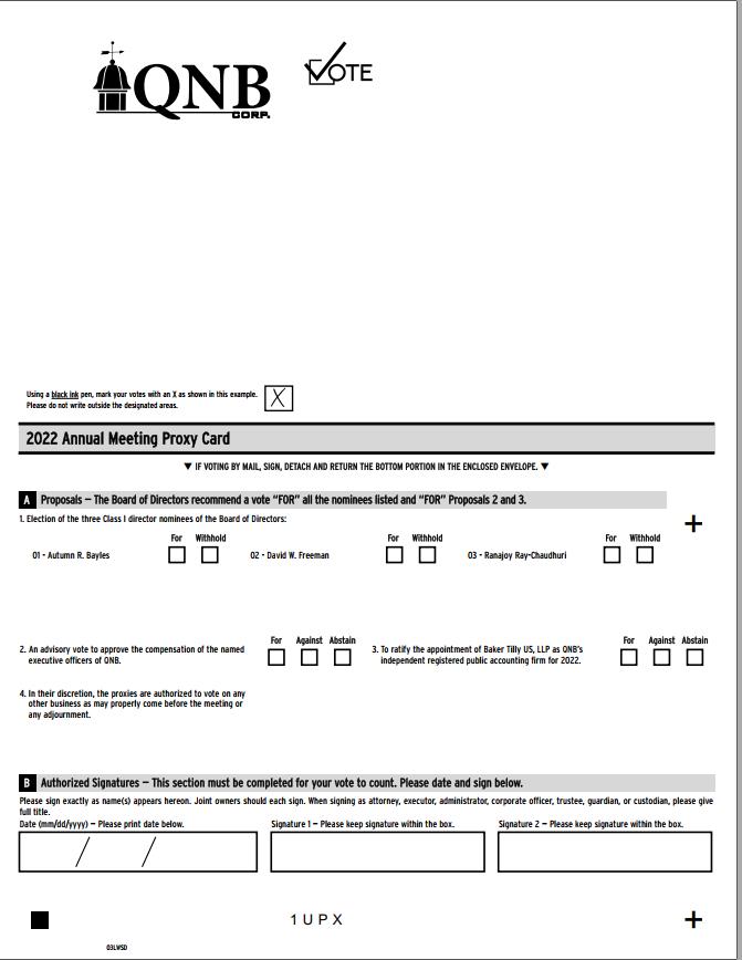 QNB’s annual shareholders’ meeting will be held in a virtual format on Tuesday, May 24, 2022, beginning at 11:00 a.m., Eastern time. To be admitted to the Annual Meeting at meetnow.global/MQLURHW, you must enter the control number found on your proxy card, voting instruction form or notice that you received previously.
