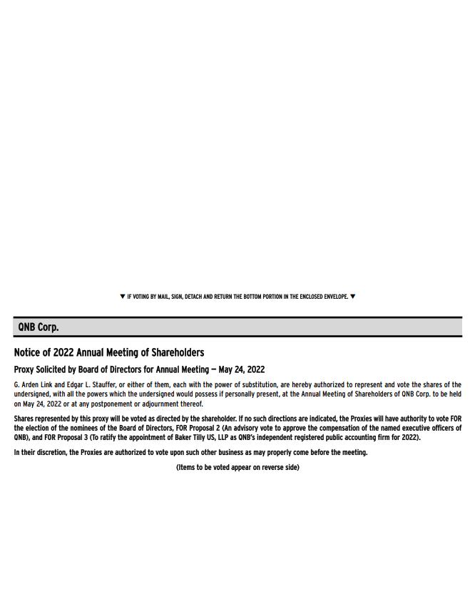 IMPORTANT NOTICE REGARDING INTERNET AVAILABILITY OF PROXY MATERIALS FOR THE SHAREHOLDER MEETING TO BE HELD ON MAY 24, 2022: Under Securities and Exchange Commission rules, you are receiving this notice that the proxy materials for the 2022 Annual Meeting of Shareholders are available on the Internet. The proxy statement, the proxy card and the 2021 Annual Report to Shareholders on Form 10-K are available at www.qnbbank.com under the “Investor Relations” link.