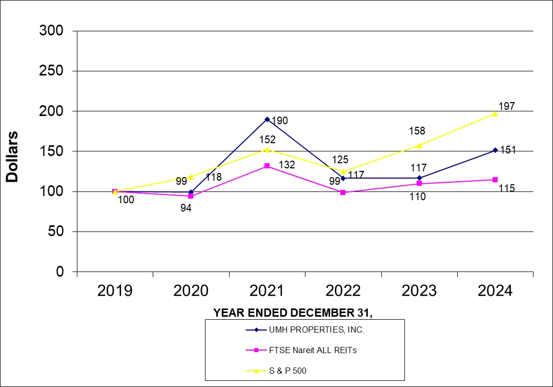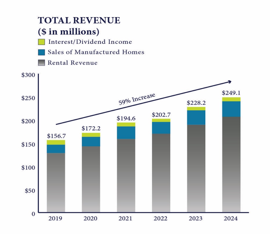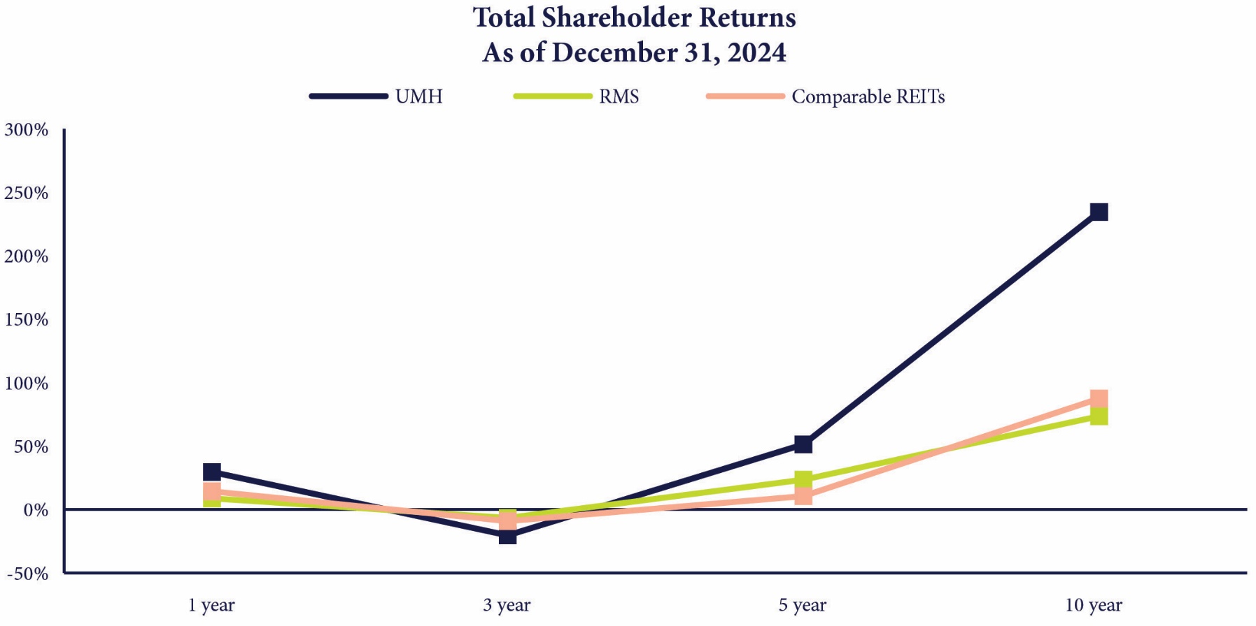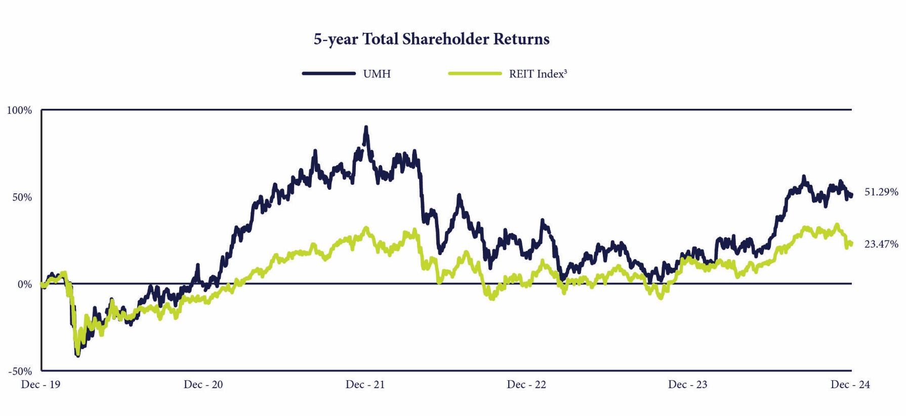 In 2024, UMH was ranked by KeyBanc the best performing publicly traded manufactured housing REIT, based upon total shareholder return.1 The Company made substantial progress on multiple fronts – generating solid operating results, achieving strong growth and improving our financial position. The following are some of our many financial performance, strategic growth and capital markets accomplishments achieved during fiscal 2024: