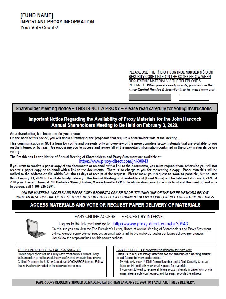 You are invited to attend your fund's annual shareholder meeting. The meeting will be held on Monday, February 3, 2020, at 2:00 P.M., Eastern time, at the offices of John Hancock Investment Management, 200 Berkeley Street, Boston, Massachusetts 02116.