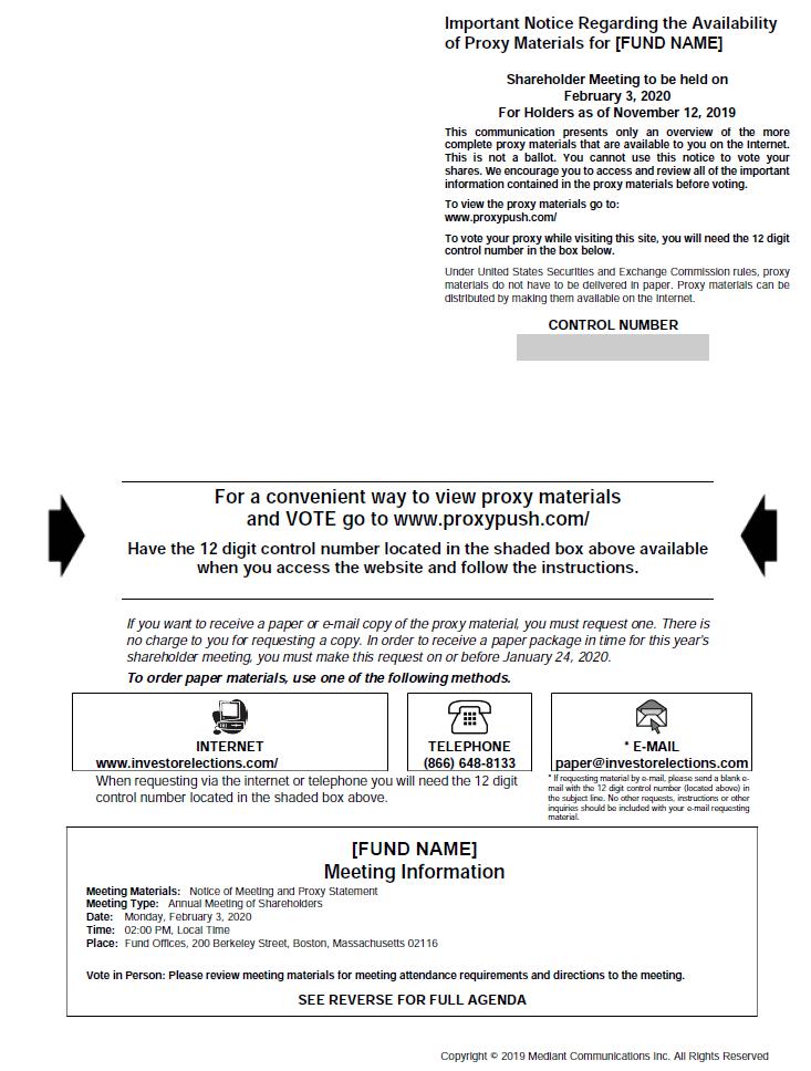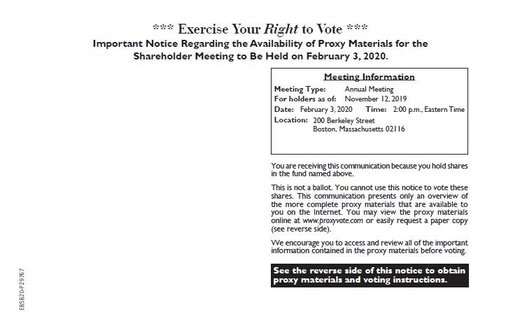 Notice is hereby given that an annual meeting of shareholders for each fund will be held at 200 Berkeley Street, Boston, Massachusetts 02116, on Monday, February 3, 2020, at 2:00 P.M., Eastern time (the "Meeting"). The Meeting will be held for the following purpose:
