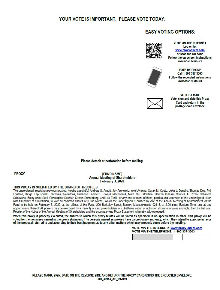 You are invited to attend your fund's annual shareholder meeting. The meeting will be held on Monday, February 3, 2020, at 2:00 P.M., Eastern time, at the offices of John Hancock Investment Management, 200 Berkeley Street, Boston, Massachusetts 02116.