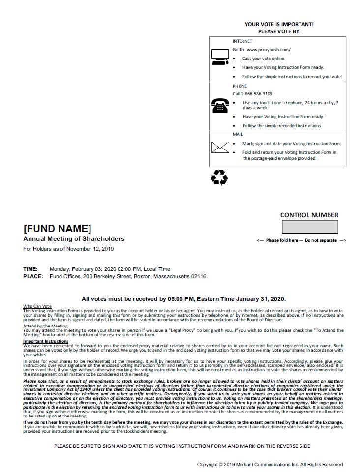 Notice is hereby given that an annual meeting of shareholders for each fund will be held at 200 Berkeley Street, Boston, Massachusetts 02116, on Monday, February 3, 2020, at 2:00 P.M., Eastern time (the "Meeting"). The Meeting will be held for the following purpose: