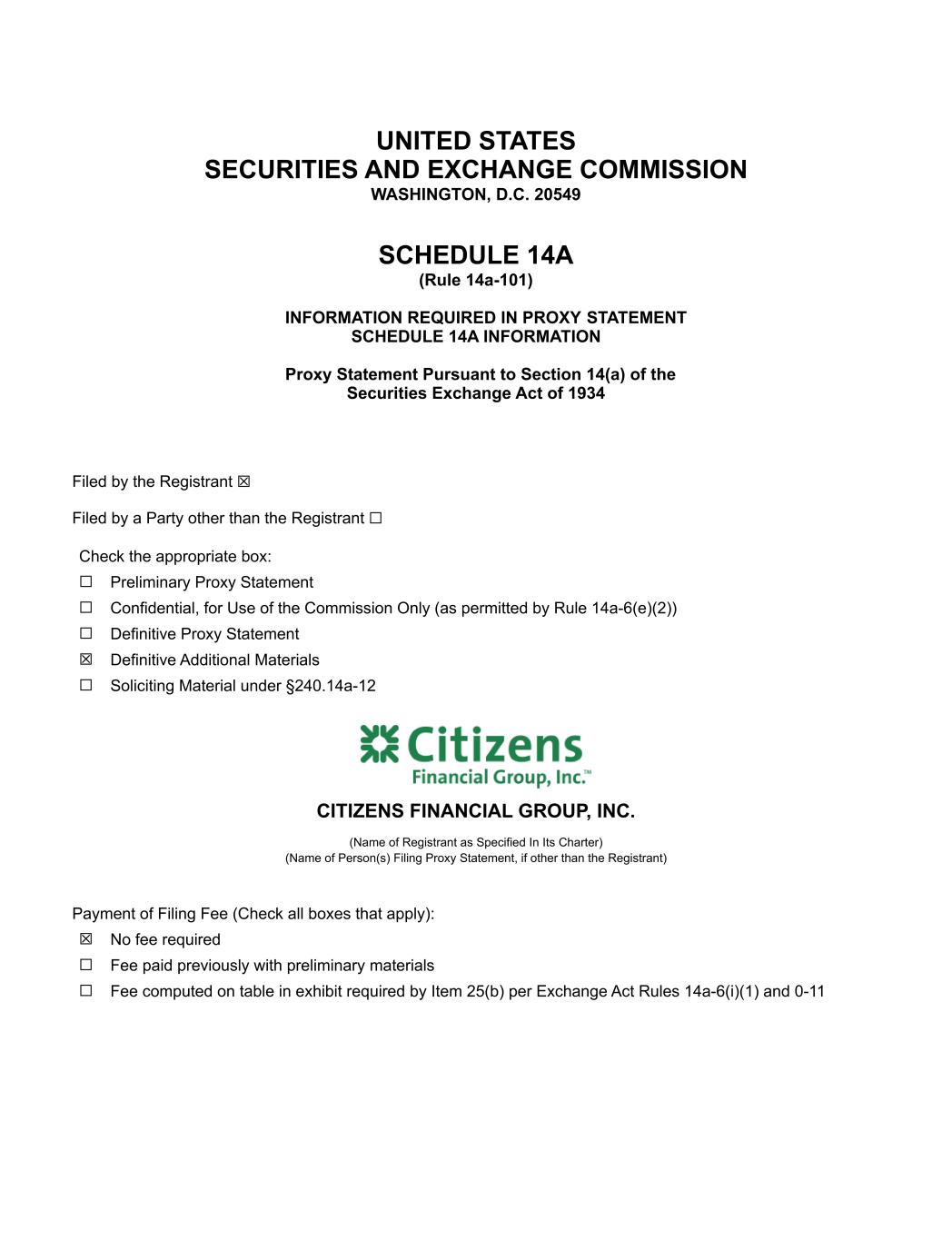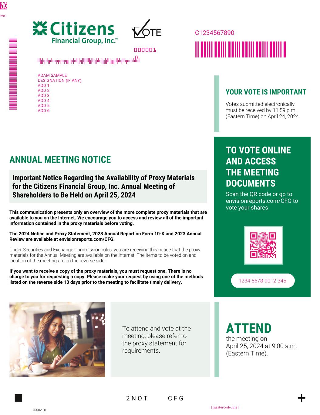 YOUR VOTE IS IMPORTANT Votes submitted electronically  must be received by 11:59 p.m.  (Eastern Time) on April 24, 2024. TO VOTE ONLINE AND ACCESS THE MEETING DOCUMENTS Scan the QR code or go to  envisionreports.com/CFG to  vote your shares ANNUAL MEETING NOTICE Important Notice Regarding the Availability of Proxy Materials for the Citizens Financial Group, Inc. Annual Meeting of Shareholders to Be Held on April 25, 2024 This communication presents only an overview of the more complete proxy materials that are available to you on the Internet. We encourage you to access and review all of the important information contained in the proxy materials before voting. The 2024 Notice and Proxy Statement, 2023 Annual Report on Form 10-K and 2023 Annual Review are available at envisionreports.com/CFG. Under Securities and Exchange Commission rules, you are receiving this notice that the proxy materials for the Annual Meeting are available on the Internet. The items to be voted on and location of the meeting are on the reverse side. If you want to receive a copy of the proxy materials, you must request one. There is no charge to you for requesting a copy. Please make your request by using one of the methods listed on the reverse side 10 days prior to the meeting to facilitate timely delivery. 2 N O T C F G To attend and vote at the meeting, please refer to the proxy statement for requirements. ATTEND the meeting on April 25, 2024 at 9:00 a.m. (Eastern Time). 03XMDH