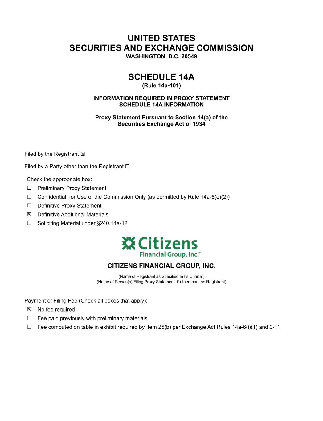 UNITED STATES  SECURITIES AND EXCHANGE COMMISSION WASHINGTON, D.C. 20549  SCHEDULE 14A (Rule 14a-101)  INFORMATION REQUIRED IN PROXY STATEMENT  SCHEDULE 14A INFORMATION  Proxy Statement Pursuant to Section 14(a) of the  Securities Exchange Act of 1934  Filed by the Registrant ☒   Filed by a Party other than the Registrant ☐ Check the appropriate box:  ☐ Preliminary Proxy Statement ☐ Confidential, for Use of the Commission Only (as permitted by Rule 14a-6(e)(2)) ☐ Definitive Proxy Statement ☒ Definitive Additional Materials ☐ Soliciting Material under §240.14a-12 CITIZENS FINANCIAL GROUP, INC. (Name of Registrant as Specified In Its Charter)  (Name of Person(s) Filing Proxy Statement, if other than the Registrant) Payment of Filing Fee (Check all boxes that apply):  ☒ No fee required ☐ Fee paid previously with preliminary materials ☐ Fee computed on table in exhibit required by Item 25(b) per Exchange Act Rules 14a-6(i)(1) and 0-11