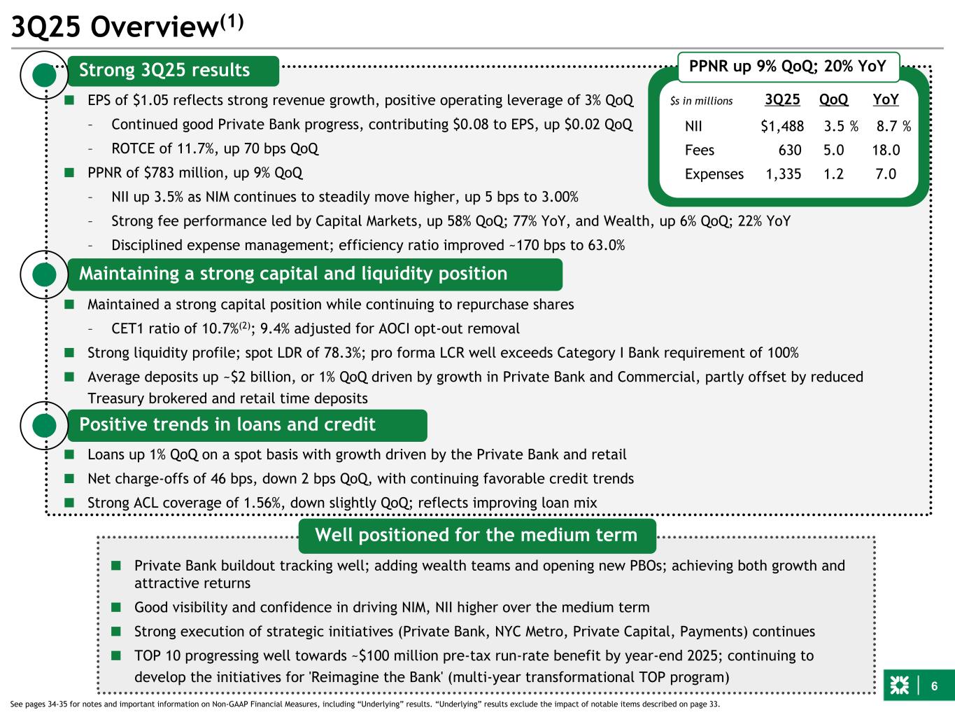 6 ■ EPS of $1.05 reflects strong revenue growth, positive operating leverage of 3% QoQ – Continued good Private Bank progress, contributing $0.08 to EPS, up $0.02 QoQ – ROTCE of 11.7%, up 70 bps QoQ ■ PPNR of $783 million, up 9% QoQ – NII up 3.5% as NIM continues to steadily move higher, up 5 bps to 3.00% – Strong fee performance led by Capital Markets, up 58% QoQ; 77% YoY, and Wealth, up 6% QoQ; 22% YoY – Disciplined expense management; efficiency ratio improved ~170 bps to 63.0% Strong 3Q25 results Maintaining a strong capital and liquidity position Positive trends in loans and credit 3Q25 Overview(1) ■ Maintained a strong capital position while continuing to repurchase shares – CET1 ratio of 10.7%(2); 9.4% adjusted for AOCI opt-out removal   ■ Strong liquidity profile; spot LDR of 78.3%; pro forma LCR well exceeds Category I Bank requirement of 100%  ■ Average deposits up ~$2 billion, or 1% QoQ driven by growth in Private Bank and Commercial, partly offset by reduced  Treasury brokered and retail time deposits 3Q25 QoQ YoY NII $ 1,488  3.5 %  8.7 % Fees  630 5.0 18.0 Expenses  1,335 1.2 7.0 $s in millions ■ Loans up 1% QoQ on a spot basis with growth driven by the Private Bank and retail ■ Net charge-offs of 46 bps, down 2 bps QoQ, with continuing favorable credit trends ■ Strong ACL coverage of 1.56%, down slightly QoQ; reflects improving loan mix PPNR up 9% QoQ; 20% YoY ■ Private Bank buildout tracking well; adding wealth teams and opening new PBOs; achieving both growth and  attractive returns ■ Good visibility and confidence in driving NIM, NII higher over the medium term ■ Strong execution of strategic initiatives (Private Bank, NYC Metro, Private Capital, Payments) continues  ■ TOP 10 progressing well towards ~$100 million pre-tax run-rate benefit by year-end 2025; continuing to  develop the initiatives for 'Reimagine the Bank' (multi-year transformational TOP program) Well positioned for the medium term See pages 34-35 for notes and important information on Non-GAAP Financial Measures, including “Underlying” results. “Underlying” results exclude the impact of notable items described on page 33.