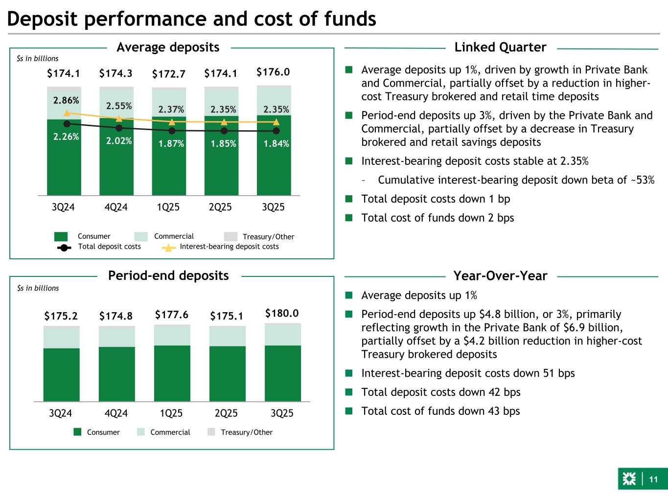 11 $174.1 $174.3 $172.7 $174.1 $176.0 3Q24 4Q24 1Q25 2Q25 3Q25 Deposit performance and cost of funds $s in billions Average deposits 2.26% 2.02% 1.87% 1.85% 1.84% 2.86% 2.55% 2.37% 2.35% 2.35% Total deposit costs Interest-bearing deposit costs CommercialConsumer Treasury/Other Year-Over-YearPeriod-end deposits Linked Quarter ■ Average deposits up 1%, driven by growth in Private Bank  and Commercial, partially offset by a reduction in higher- cost Treasury brokered and retail time deposits ■ Period-end deposits up 3%, driven by the Private Bank and  Commercial, partially offset by a decrease in Treasury  brokered and retail savings deposits ■ Interest-bearing deposit costs stable at 2.35% – Cumulative interest-bearing deposit down beta of ~53%  ■ Total deposit costs down 1 bp ■ Total cost of funds down 2 bps $s in billions ■ Average deposits up 1% ■ Period-end deposits up $4.8 billion, or 3%, primarily  reflecting growth in the Private Bank of $6.9 billion,  partially offset by a $4.2 billion reduction in higher-cost  Treasury brokered deposits  ■ Interest-bearing deposit costs down 51 bps ■ Total deposit costs down 42 bps  ■ Total cost of funds down 43 bps $175.2 $174.8 $177.6 $175.1 $180.0 Consumer Commercial Treasury/Other 3Q24 4Q24 1Q25 2Q25 3Q25